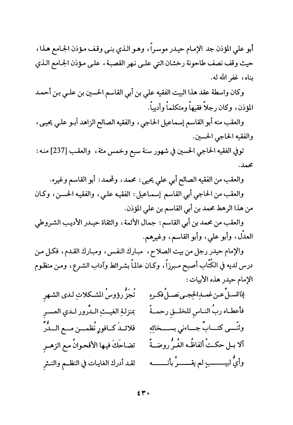والإمام حيدر رجل من بيت الصلاح، مبارك النفس، ومبارك القدم، فكل من درس لديه في الكتّاب أصبح مبرزا، وكان عالما بشرائط وآداب الشرع، ومن منظوم الإمام حيدر هذه الأبيات: