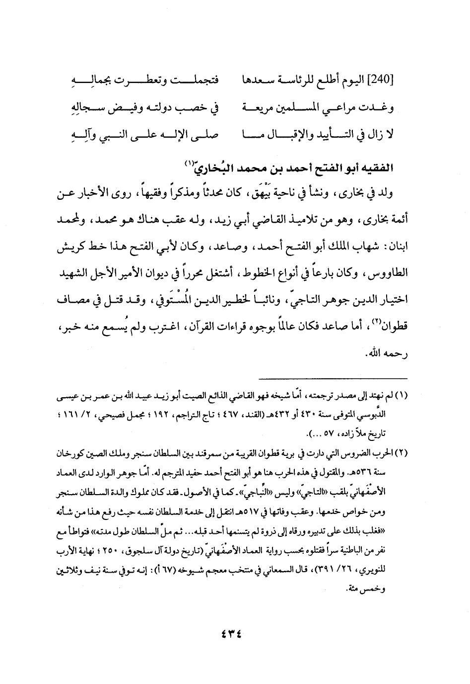 ولد في بخارى، ونشأ في ناحية بيهق، كان محدثا ومذكرا وفقيها، روى الأخبار عن أئمة بخارى، وهو من تلاميذ القاضي أبي زيد، وله عقب هناك هو محمد، ولمحمد ابنان: شهاب الملك أبو الفتح أحمد، وصاعد، وكان لأبي الفتح هذا خط كريش الطاووس، وكان بارعا في أنواع الخطوط، أشتغل محررا في ديوان الأمير الأجل الشهيد اختيار الدين جوهر التاجيّ، ونائبا لخطير الدين المستوفي، وقد قتل في مصاف قطوان «2» ، أما صاعد فكان عالما بوجوه قراءات القرآن، اغترب ولم يسمع منه خبر، رحمه الله.