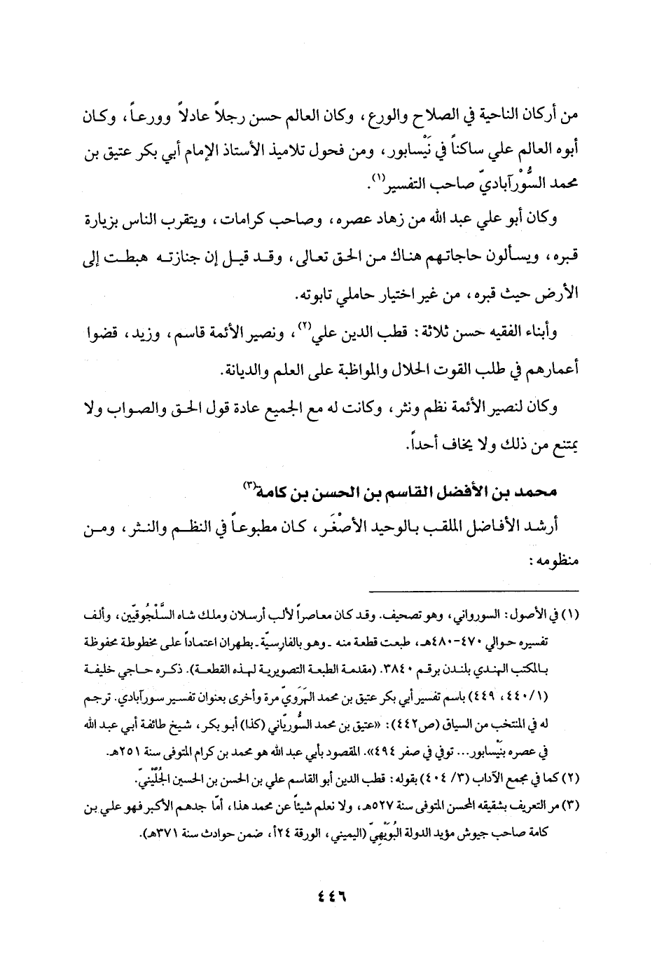 من أركان الناحية في الصلاح والورع، وكان العالم حسن رجلا عادلا وورعا، وكان أبوه العالم علي ساكنا في نيسابور، ومن فحول تلاميذ الأستاذ الإمام أبي بكر عتيق بن محمد السّورآباديّ صاحب التفسير «1» .