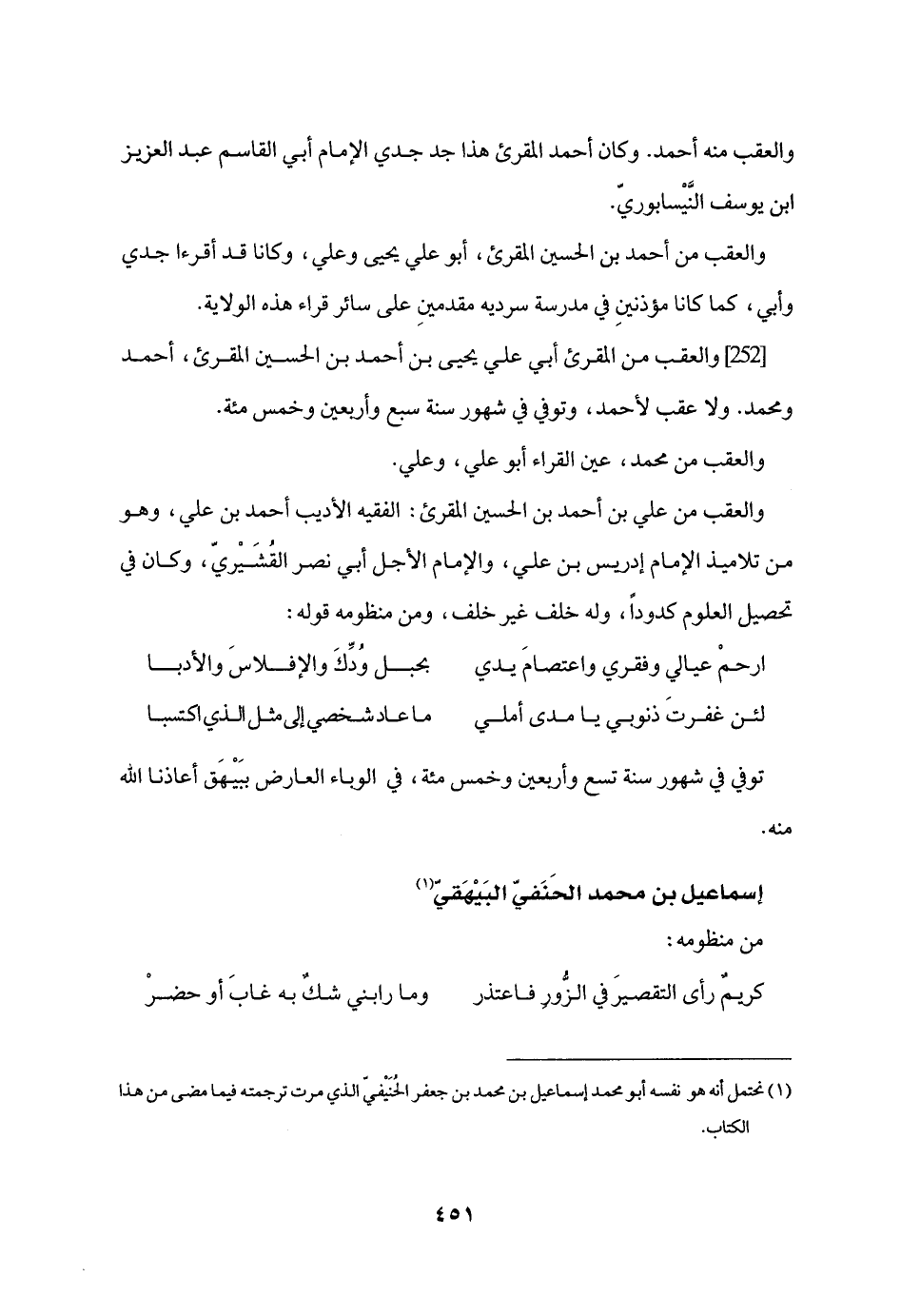 [252] والعقب من المقرئ أبي علي يحيى بن أحمد بن الحسين المقرئ، أحمد ومحمد. ولا عقب لأحمد، وتوفي في شهور سنة سبع وأربعين وخمس مئة.