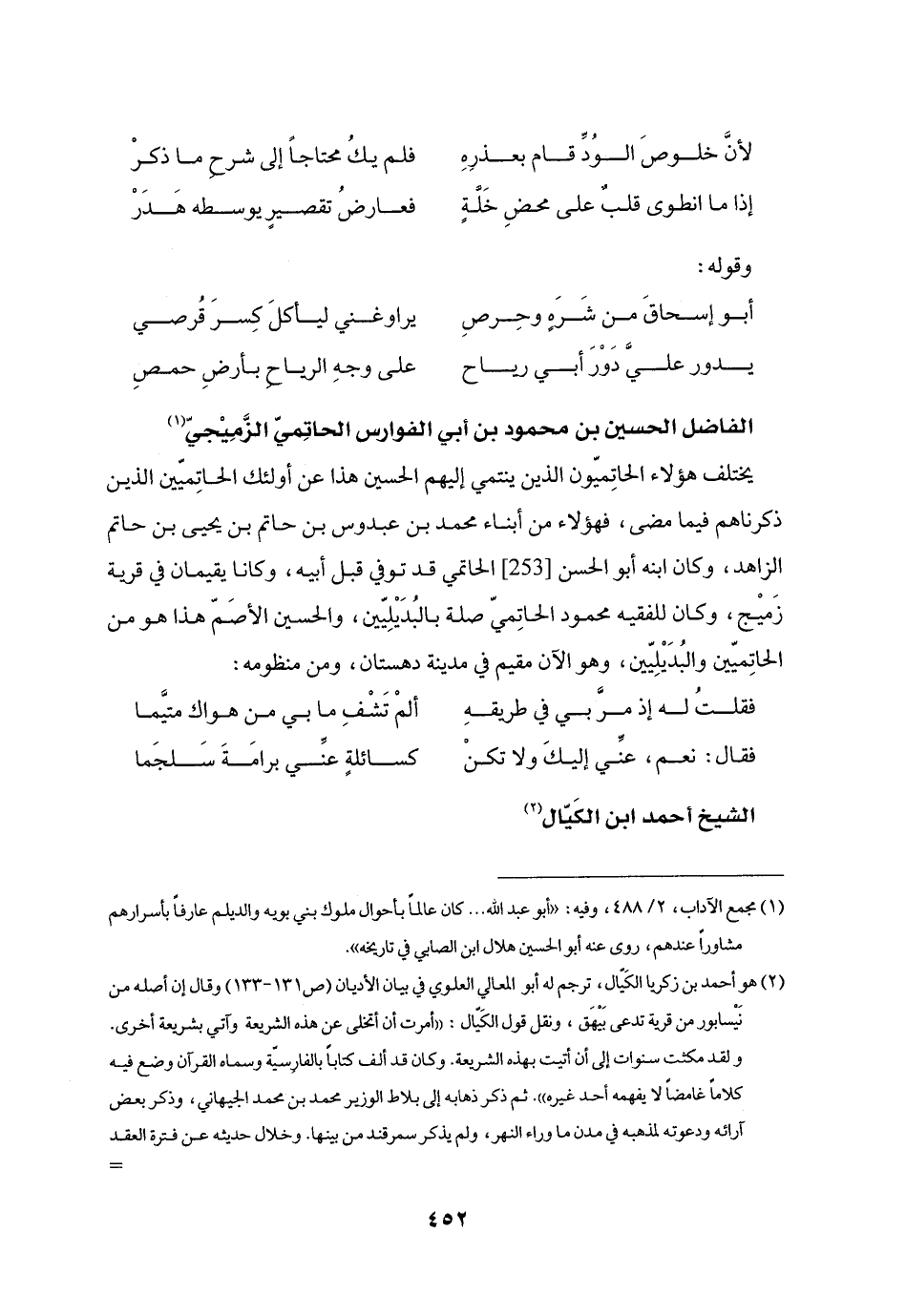 يختلف هؤلاء الحاتميّون الذين ينتمي إليهم الحسين هذا عن أولئك الحاتميّين الذين ذكرناهم فيما مضى، فهؤلاء من أبناء محمد بن عبدوس بن حاتم بن يحيى بن حاتم الزاهد، وكان ابنه أبو الحسن [253] الحاتمي قد توفي قبل أبيه، وكانا يقيمان في قرية زميج، وكان للفقيه محمود الحاتميّ صلة بالبديليّين، والحسين الأصمّ هذا هو من الحاتميّين والبديليّين، وهو الآن مقيم في مدينة دهستان، ومن منظومه: