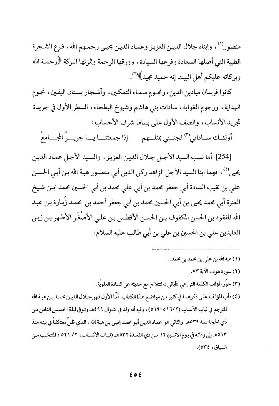 [254] أما نسب السيد الأجل جلال الدين العزيز، والسيد الأجل عماد الدين يحيى «4» ، فهما ابنا السيد الأجل الزاهد ركن الدين أبي منصور هبة الله بن أبي الحسن علي بن نقيب السادة أبي جعفر محمد بن أبي علي محمد بن أبي الحسين محمد ابن شيخ العترة أبي محمد يحيى بن أبي الحسين محمد بن أبي جعفر أحمد بن محمد زبارة بن عبد الله المفقود بن الحسن المكفوف بن الحسن الأفطس بن علي الأصغر الأطهر بن زين العابدين علي بن الحسين بن علي بن أبي طالب عليه السلام: