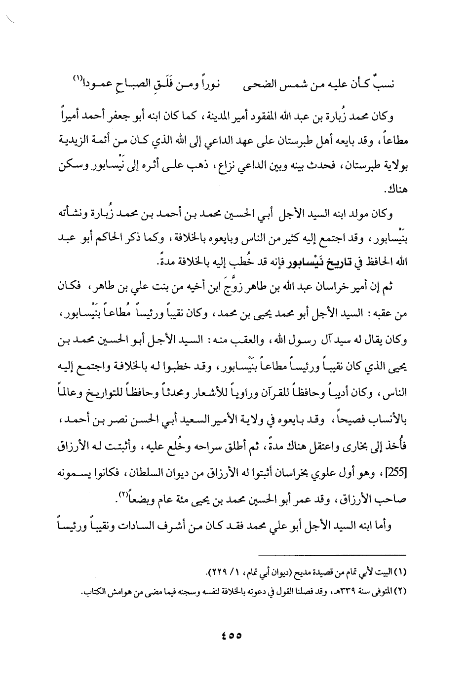 ثم إن أمير خراسان عبد الله بن طاهر زوّج ابن أخيه من بنت علي بن طاهر، فكان من عقبه: السيد الأجل أبو محمد يحيى بن محمد، وكان نقيبا ورئيسا مطاعا بنيسابور، وكان يقال له سيد آل رسول الله، والعقب منه: السيد الأجل أبو الحسين محمد بن يحيى الذي كان نقيبا ورئيسا مطاعا بنيسابور، وقد خطبوا له بالخلافة واجتمع إليه الناس، وكان أديبا وحافظا للقرآن وراويا للأشعار ومحدثا وحافظا للتواريخ وعالما بالأنساب فصيحا، وقد بايعوه في ولاية الأمير السعيد أبي الحسن نصر بن أحمد، فأخذ إلى بخارى واعتقل هناك مدة، ثم أطلق سراحه وخلع عليه، وأثبتت له الأرزاق [255] ، وهو أول علوي بخراسان أثبتوا له الأرزاق من ديوان السلطان، فكانوا يسمونه صاحب الأرزاق، وقد عمر أبو الحسين محمد بن يحيى مئة عام وبضعا «2» .