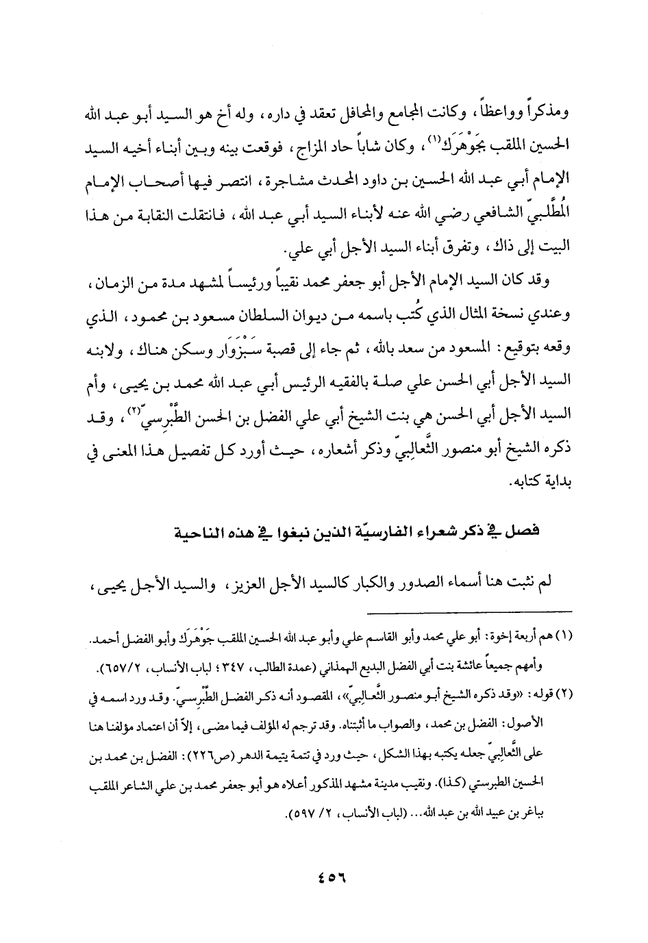 وقد كان السيد الإمام الأجل أبو جعفر محمد نقيبا ورئيسا لمشهد مدة من الزمان، وعندي نسخة المثال الذي كتب باسمه من ديوان السلطان مسعود بن محمود، الذي وقعه بتوقيع: المسعود من سعد بالله، ثم جاء إلى قصبة سبزوار وسكن هناك، ولابنه السيد الأجل أبي الحسن علي صلة بالفقيه الرئيس أبي عبد الله محمد بن يحيى، وأم السيد الأجل أبي الحسن هي بنت الشيخ أبي علي الفضل بن الحسن الطّبرسيّ «2» ، وقد ذكره الشيخ أبو منصور الثّعالبيّ وذكر أشعاره، حيث أورد كل تفصيل هذا المعنى في بداية كتابه.