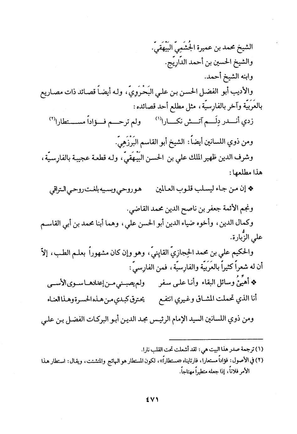 والأديب أبو الفضل الحسن بن علي البحرويّ، وله أيضا قصائد ذات مصاريع بالعربيّة وآخر بالفارسيّة، مثل مطلع أحد قصائده: