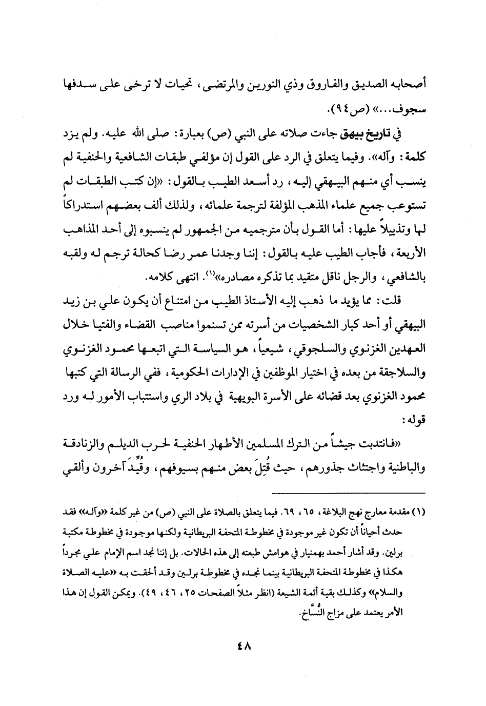 في تاريخ بيهق جاءت صلاته على النبي (ص) بعبارة: صلى الله عليه. ولم يزد كلمة: وآله» . وفيما يتعلق في الرد على القول إن مؤلفي طبقات الشافعية والحنفية لم ينسب أي منهم البيهقي إليه، رد أسعد الطيب بالقول: «إن كتب الطبقات لم تستوعب جميع علماء المذهب المؤلفة لترجمة علمائه، ولذلك ألف بعضهم استدراكا لها وتذييلا عليها: أما القول بأن مترجميه من الجمهور لم ينسبوه إلى أحد المذاهب الأربعة، فأجاب الطيب عليه بالقول: إننا وجدنا عمر رضا كحالة ترجم له ولقبه بالشافعي، والرجل ناقل متقيد بما تذكره مصادره» «1» . انتهى كلامه.