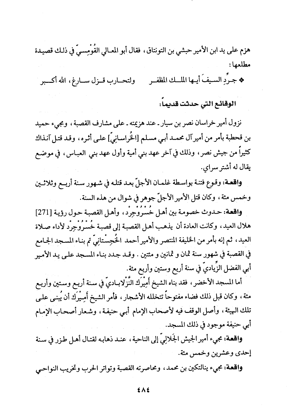 واقعة: حدوث خصومة بين أهل خسروجرد، وأهل القصبة حول رؤية [271] هلال العيد، وكانت العادة أن يذهب أهل القصبة إلى قصبة خسروجرد لأداء صلاة العيد، ثم إنه بأمر من الخليفة المنتصر والأمير أحمد الخجستانيّ تم بناء المسجد الجامع في القصبة في شهور سنة ثمان وثمانين ومئتين. وقد جدد بناء المسجد على يد الأمير أبي الفضل الزّياديّ في سنة أربع وستين وأربع مئة.