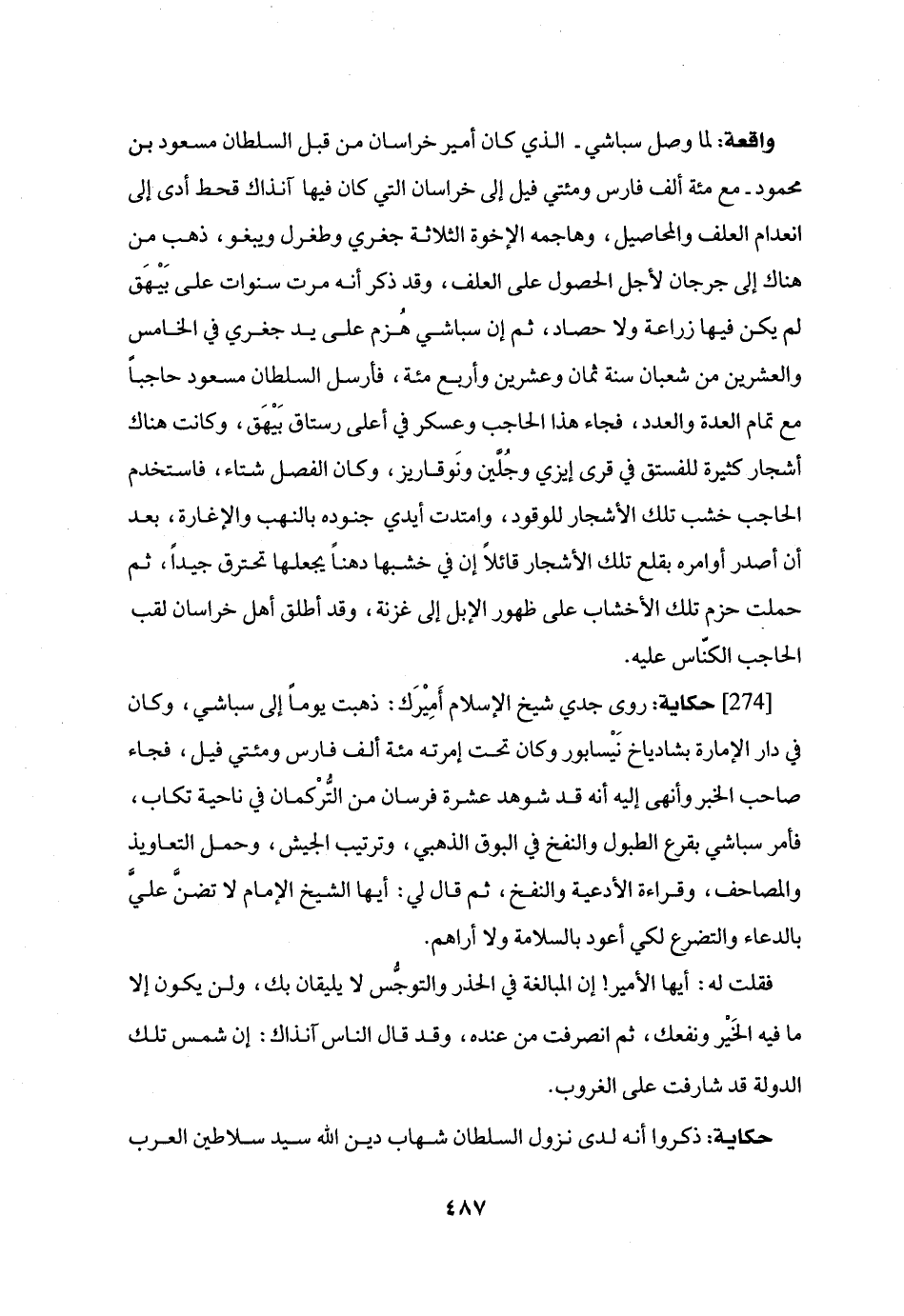[274] حكاية: روى جدي شيخ الإسلام أميرك: ذهبت يوما إلى سباشي، وكان في دار الإمارة بشادياخ نيسابور وكان تحت إمرته مئة ألف فارس ومئتي فيل، فجاء صاحب الخبر وأنهى إليه أنه قد شوهد عشرة فرسان من التّركمان في ناحية تكاب، فأمر سباشي بقرع الطبول والنفخ في البوق الذهبي، وترتيب الجيش، وحمل التعاويذ والمصاحف، وقراءة الأدعية والنفخ، ثم قال لي: أيها الشيخ الإمام لا تضنّ عليّ بالدعاء والتضرع لكي أعود بالسلامة ولا أراهم.