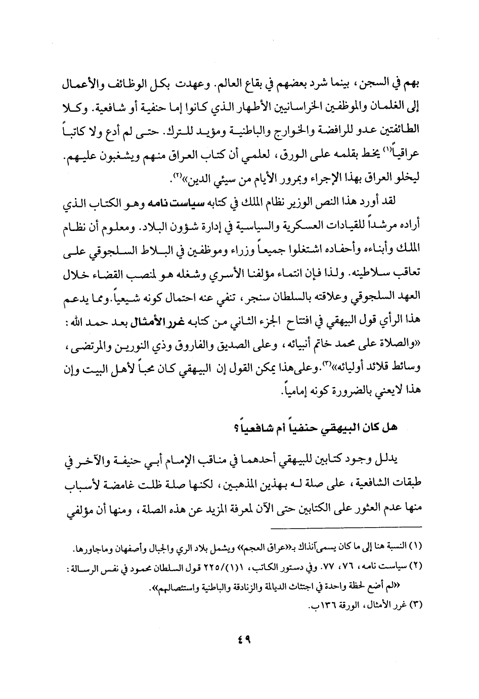 لقد أورد هذا النص الوزير نظام الملك في كتابه سياست نامه وهو الكتاب الذي أراده مرشدا للقيادات العسكرية والسياسية في إدارة شؤون البلاد. ومعلوم أن نظام الملك وأبناءه وأحفاده اشتغلوا جميعا وزراء وموظفين في البلاط السلجوقي على تعاقب سلاطينه. ولذا فإن انتماء مؤلفنا الأسري وشغله هو لمنصب القضاء خلال العهد السلجوقي وعلاقته بالسلطان سنجر، تنفي عنه احتمال كونه شيعيا. ومما يدعم هذا الرأي قول البيهقي في افتتاح الجزء الثاني من كتابه غرر الأمثال بعد حمد الله: