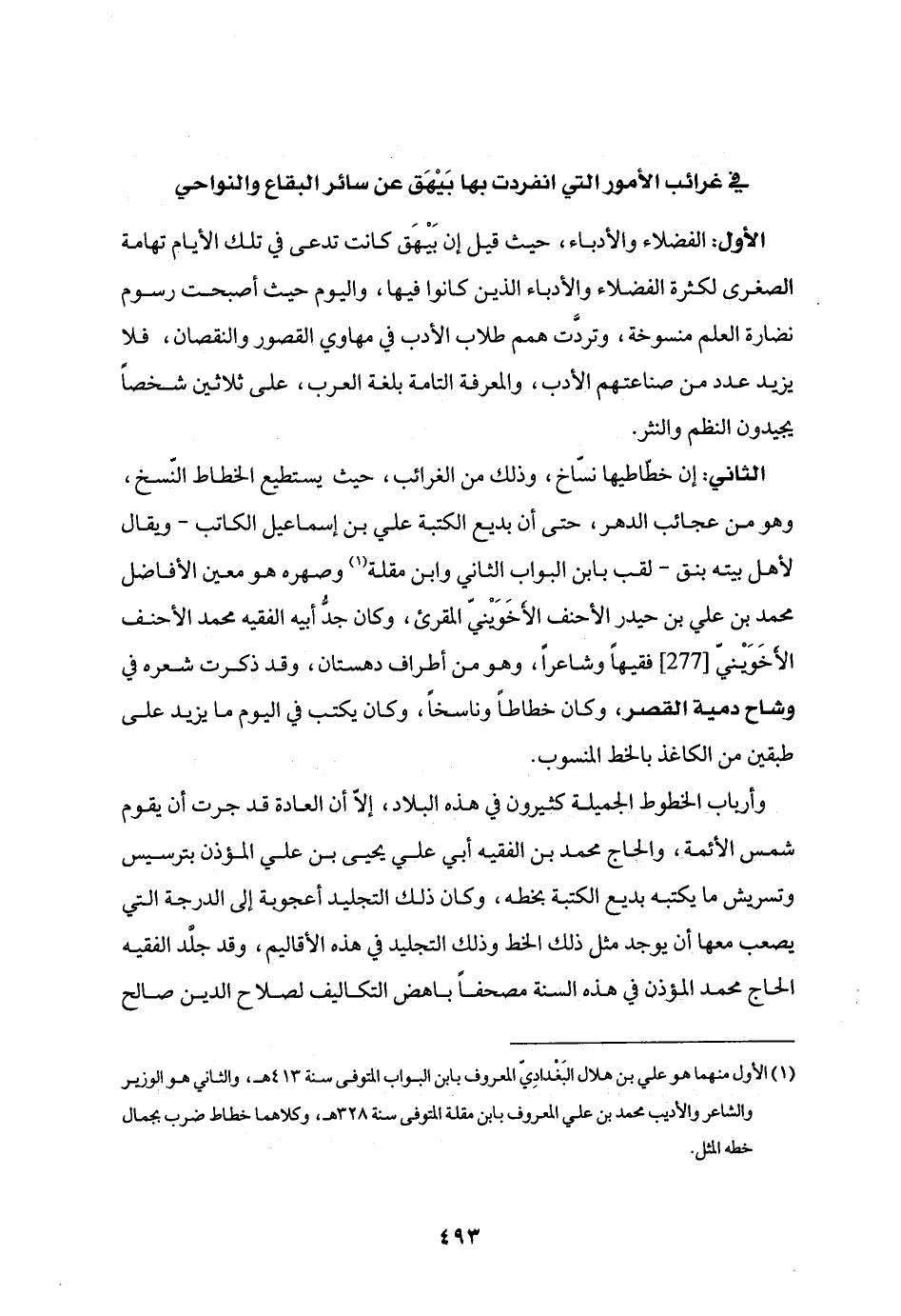 الثاني: إن خطّاطيها نسّاخ، وذلك من الغرائب، حيث يستطيع الخطاط النّسخ، وهو من عجائب الدهر، حتى أن بديع الكتبة علي بن إسماعيل الكاتب- ويقال لأهل بيته بنق- لقب بابن البواب الثاني وابن مقلة «1» وصهره هو معين الأفاضل محمد بن علي بن حيدر الأحنف الأخوينيّ المقرئ، وكان جدّ أبيه الفقيه محمد الأحنف الأخوينيّ [277] فقيها وشاعرا، وهو من أطراف دهستان، وقد ذكرت شعره في وشاح دمية القصر، وكان خطاطا وناسخا، وكان يكتب في اليوم ما يزيد على طبقين من الكاغذ بالخط المنسوب.