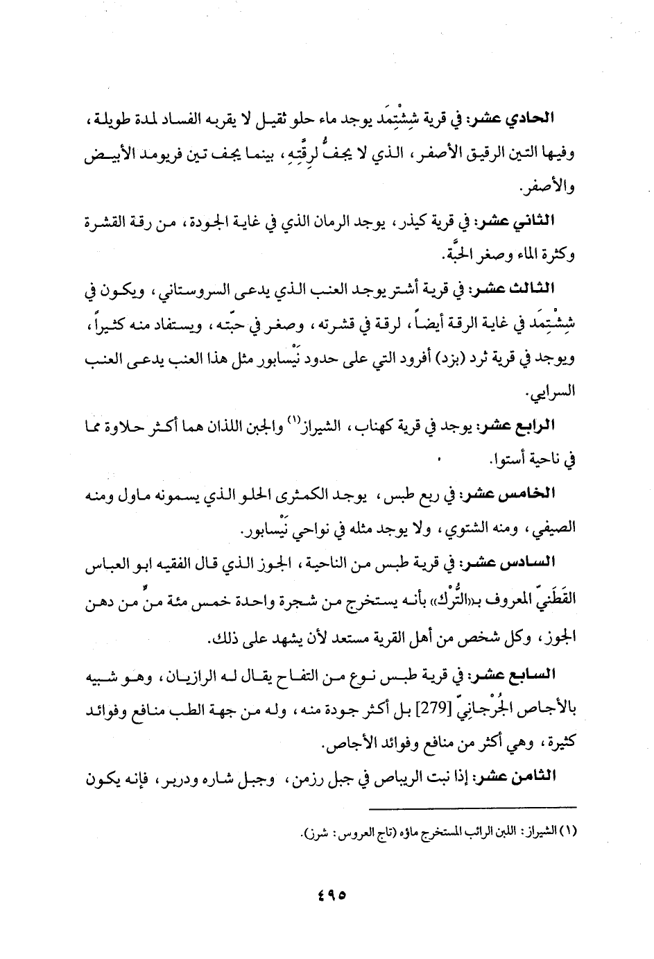 الخامس عشر: في ربع طبس، يوجد الكمثرى الحلو الذي يسمونه ماول ومنه الصيفي، ومنه الشتوي، ولا يوجد مثله في نواحي نيسابور.