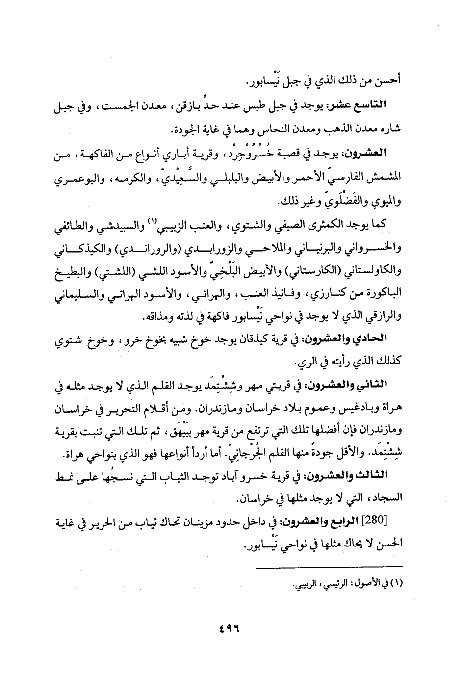 [280] الرابع والعشرون: في داخل حدود مزينان تحاك ثياب من الحرير في غاية الحسن لا يحاك مثلها في نواحي نيسابور.