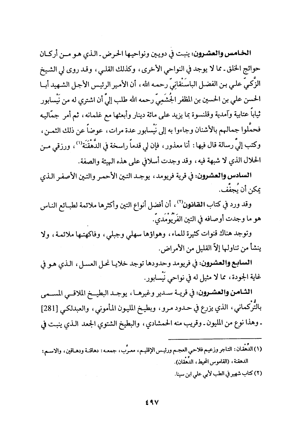 الثامن والعشرون: في قرية سدير وغيرها، يوجد البطيخ الملاقي المسمى بالتّركماني، الذي يزرع في حدود مرو، وبطيخ المليون المأموني، والعبدلكي [281]- وهذا نوع من المليون- وقريب منه الحمشادي، والبطيخ الشتوي الجعد الذي ينبت في