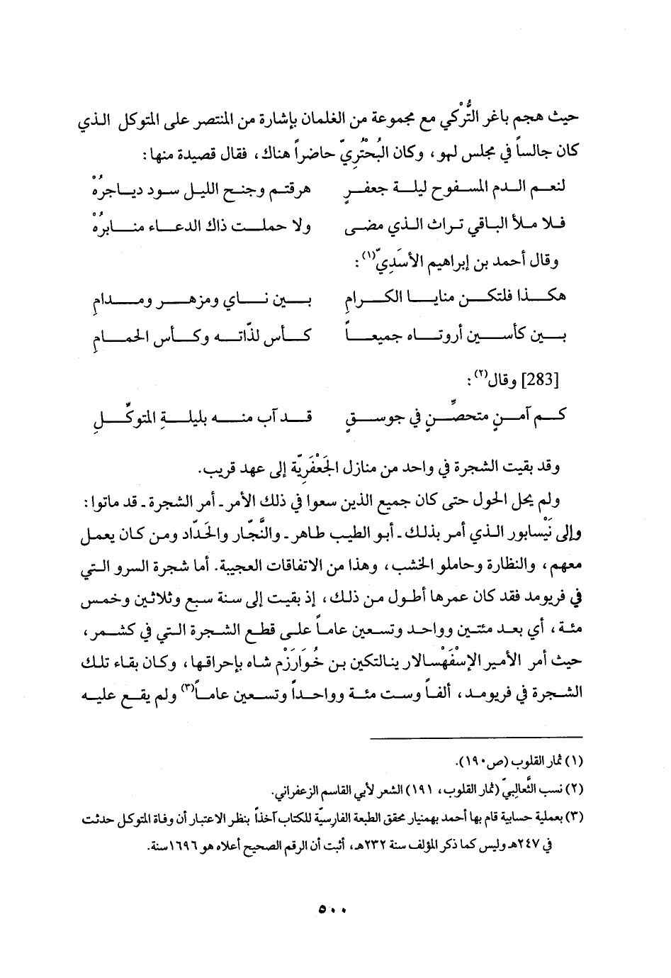 وإلى نيسابور الذي أمر بذلك- أبو الطيب طاهر- والنّجّار والحدّاد ومن كان يعمل معهم، والنظارة وحاملو الخشب، وهذا من الاتفاقات العجيبة. أما شجرة السرو التي في فريومد فقد كان عمرها أطول من ذلك، إذ بقيت إلى سنة سبع وثلاثين وخمس مئة، أي بعد مئتين وواحد وتسعين عاما على قطع الشجرة التي في كشمر، حيث أمر الأمير الإسفهسالار ينالتكين بن خوارزم شاه بإحراقها، وكان بقاء تلك الشجرة في فريومد، ألفا وست مئة وواحدا وتسعين عاما «3» ولم يقع عليه