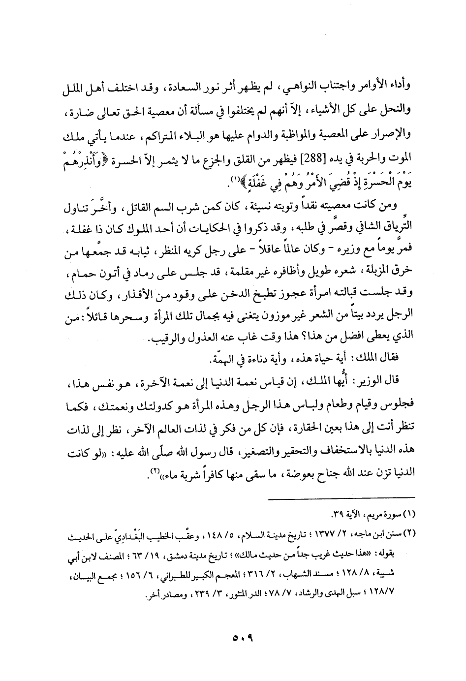 قال الوزير: أيّها الملك، إن قياس نعمة الدنيا إلى نعمة الآخرة، هو نفس هذا، فجلوس وقيام وطعام ولباس هذا الرجل وهذه المرأة هو كدولتك ونعمتك، فكما تنظر أنت إلى هذا بعين الحقارة، فإن كل من فكر في لذات العالم الآخر، نظر إلى لذات هذه الدنيا بالاستخفاف والتحقير والتصغير، قال رسول الله صلّى الله عليه: «لو كانت الدنيا تزن عند الله جناح بعوضة، ما سقى منها كافرا شربة ماء» «2» .