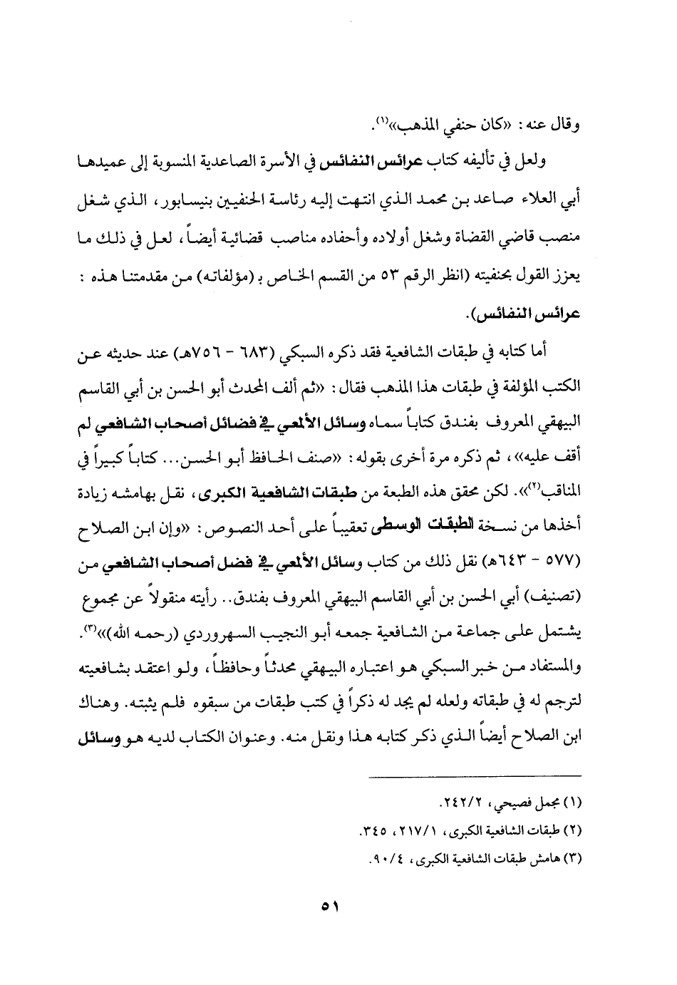 والمستفاد من خبر السبكي هو اعتباره البيهقي محدثا وحافظا، ولو اعتقد بشافعيته لترجم له في طبقاته ولعله لم يجد له ذكرا في كتب طبقات من سبقوه فلم يثبته. وهناك ابن الصلاح أيضا الذي ذكر كتابه هذا ونقل منه. وعنوان الكتاب لديه هو وسائل