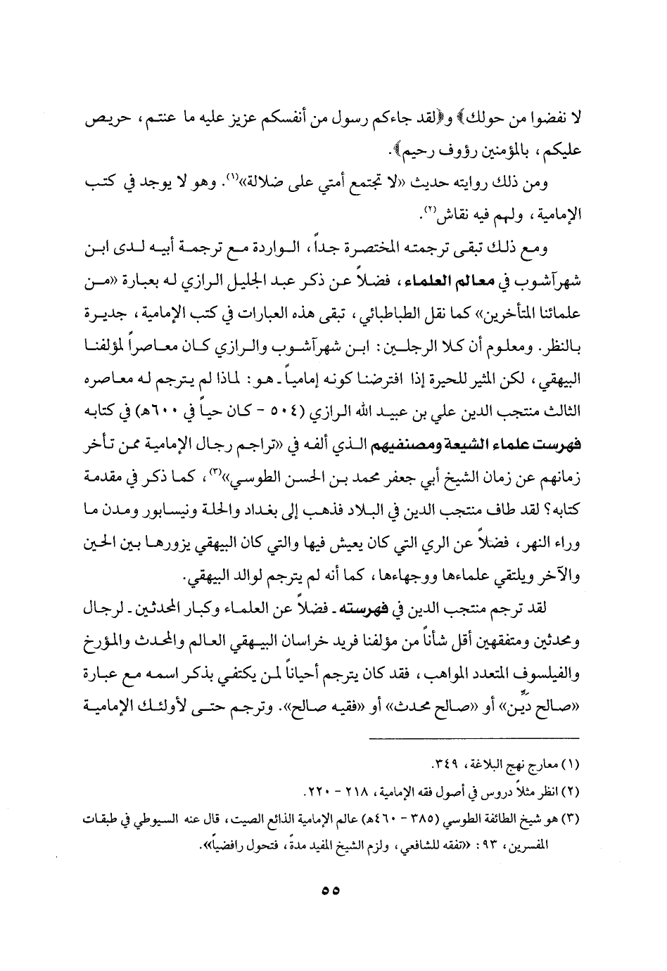 ومع ذلك تبقى ترجمته المختصرة جدا، الواردة مع ترجمة أبيه لدى ابن شهر آشوب في معالم العلماء، فضلا عن ذكر عبد الجليل الرازي له بعبارة «من علمائنا المتأخرين» كما نقل الطباطبائي، تبقى هذه العبارات في كتب الإمامية، جديرة بالنظر. ومعلوم أن كلا الرجلين: ابن شهر آشوب والرازي كان معاصرا لمؤلفنا البيهقي، لكن المثير للحيرة إذا افترضنا كونه إماميا- هو: لماذا لم يترجم له معاصره الثالث منتجب الدين علي بن عبيد الله الرازي (504- كان حيا في 600 هـ) في كتابه فهرست علماء الشيعة ومصنفيهم الذي ألفه في «تراجم رجال الإمامية ممن تأخر زمانهم عن زمان الشيخ أبي جعفر محمد بن الحسن الطوسي» «3» ، كما ذكر في مقدمة كتابه؟ لقد طاف منتجب الدين في البلاد فذهب إلى بغداد والحلة ونيسابور ومدن ما وراء النهر، فضلا عن الري التي كان يعيش فيها والتي كان البيهقي يزورها بين الحين والآخر ويلتقي علماءها ووجهاءها، كما أنه لم يترجم لوالد البيهقي.