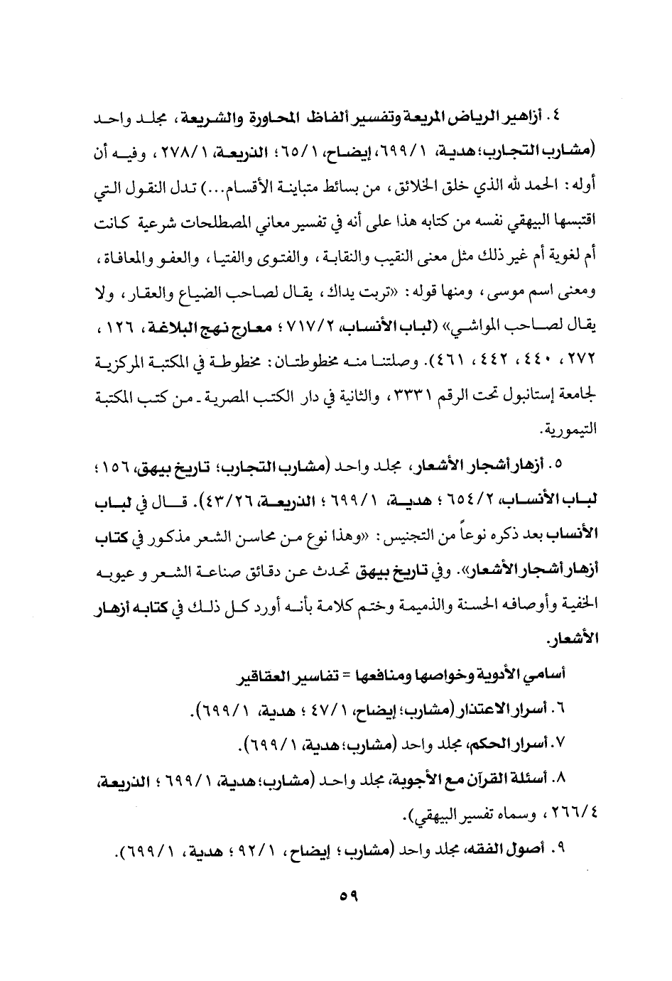 4. أزاهير الرياض المريعة وتفسير الفاظ المحاورة والشريعة، مجلد واحد (مشارب التجارب؛ هدية، 1/699، إيضاح، 1/65؛ الذريعة، 1/278، وفيه أن أوله: الحمد لله الذي خلق الخلائق، من بسائط متباينة الأقسام ... ) تدل النقول التي اقتبسها البيهقي نفسه من كتابه هذا على أنه في تفسير معاني المصطلحات شرعية كانت أم لغوية أم غير ذلك مثل معنى النقيب والنقابة، والفتوى والفتيا، والعفو والمعافاة، ومعنى اسم موسى، ومنها قوله: «تربت يداك، يقال لصاحب الضياع والعقار، ولا يقال لصاحب المواشي» (لباب الأنساب، 2/717؛ معارج نهج البلاغة، 126، 272، 440، 442، 461) . وصلتنا منه مخطوطتان: مخطوطة في المكتبة المركزية لجامعة إستانبول تحت الرقم 3331، والثانية في دار الكتب المصرية- من كتب المكتبة التيمورية.
