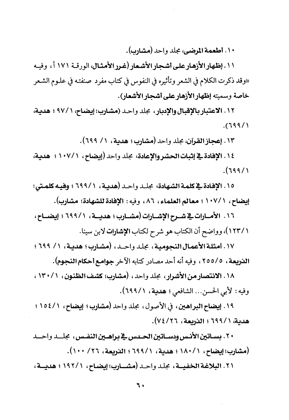 19. إيضاح البراهين، في الأصول، مجلد واحد (مشارب؛ إيضاح، 1/154؛ هدية، 1/699؛ الذريعة، 26/74) .