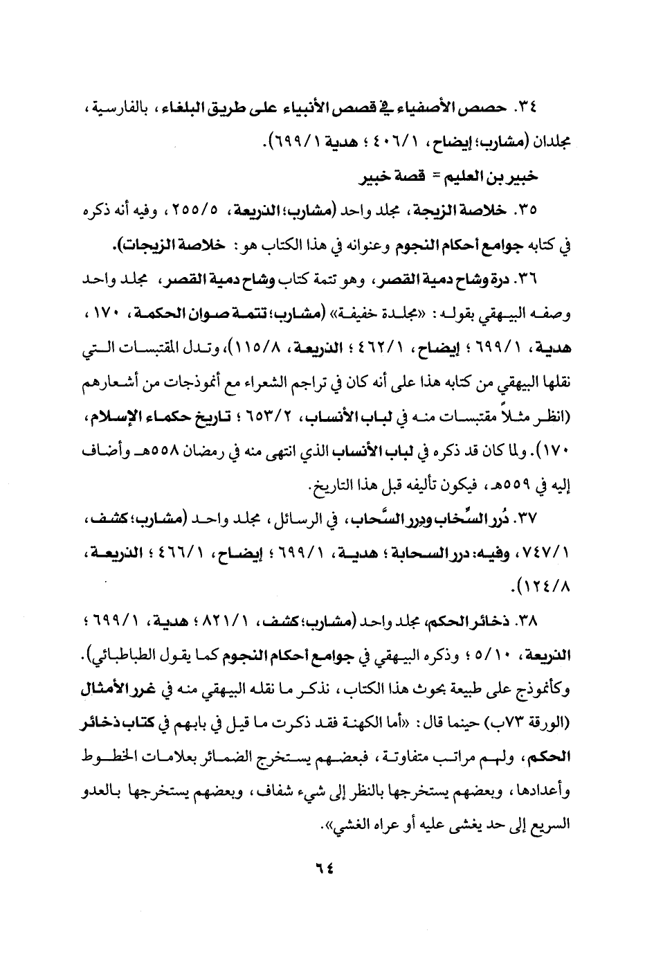 38. ذخائر الحكم، مجلد واحد (مشارب؛ كشف، 1/821؛ هدية، 1/699؛ الذريعة، 10/5؛ وذكره البيهقي في جوامع أحكام النجوم كما يقول الطباطبائي) .