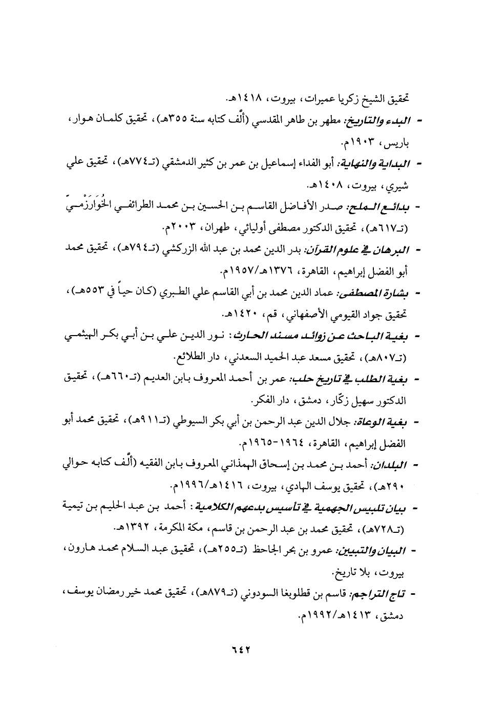 - بغية الباحث عن زوائد مسند الحارث: نور الدين علي بن أبي بكر الهيثمي (ت 807 هـ) ، تحقيق مسعد عبد الحميد السعدني، دار الطلائع.