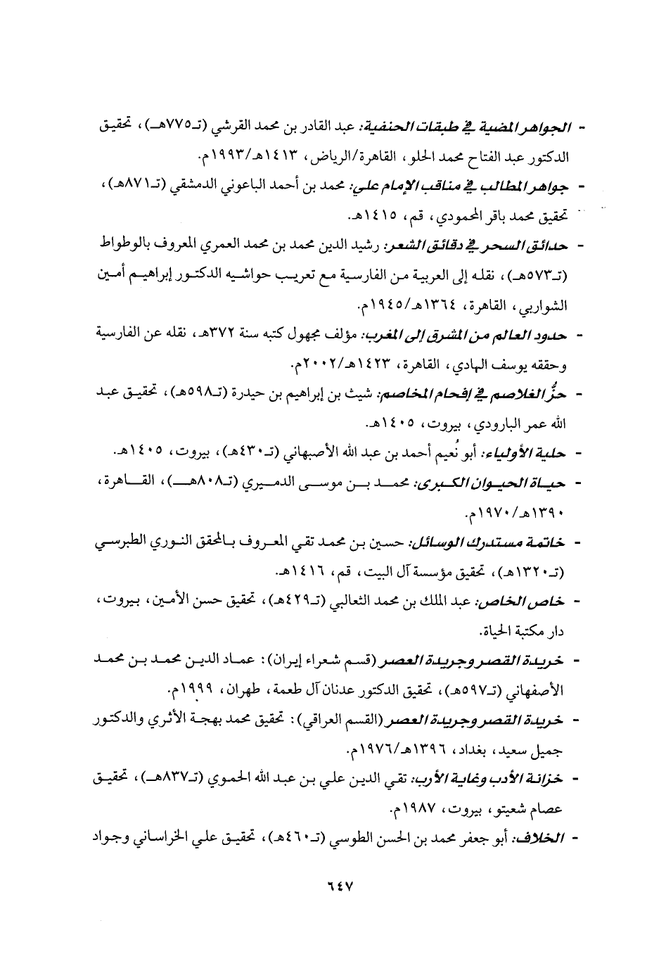 - الجواهر المضية في طبقات الحنفية: عبد القادر بن محمد القرشي (ت 775 هـ) ، تحقيق الدكتور عبد الفتاح محمد الحلو، القاهرة/ الرياض، 1413 هـ/ 1993 م.
