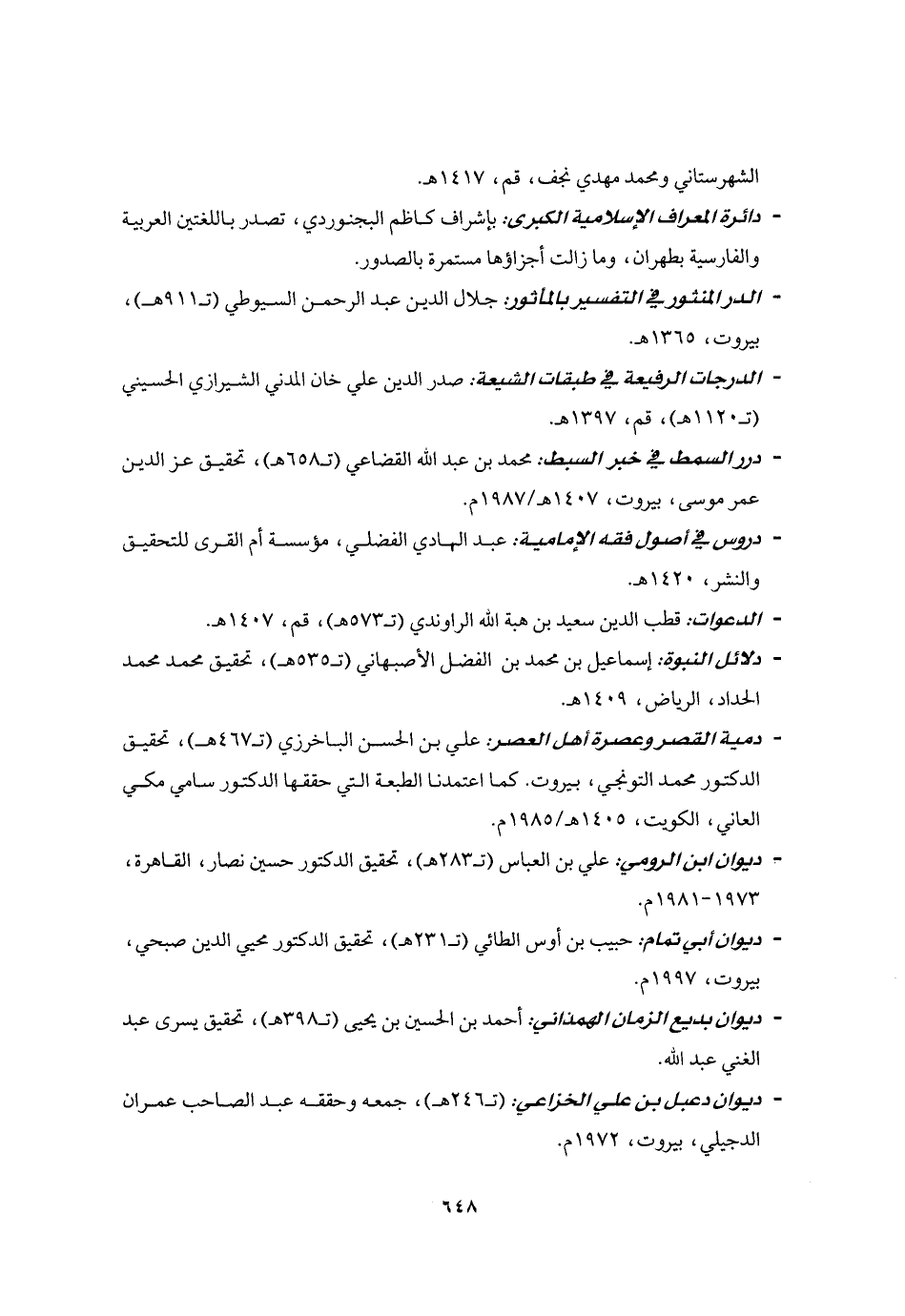 - دمية القصر وعصرة أهل العصر: علي بن الحسن الباخرزي (ت 467 هـ) ، تحقيق الدكتور محمد التونجي، بيروت. كما اعتمدنا الطبعة التي حققها الدكتور سامي مكي العاني، الكويت، 1405 هـ/ 1985 م.