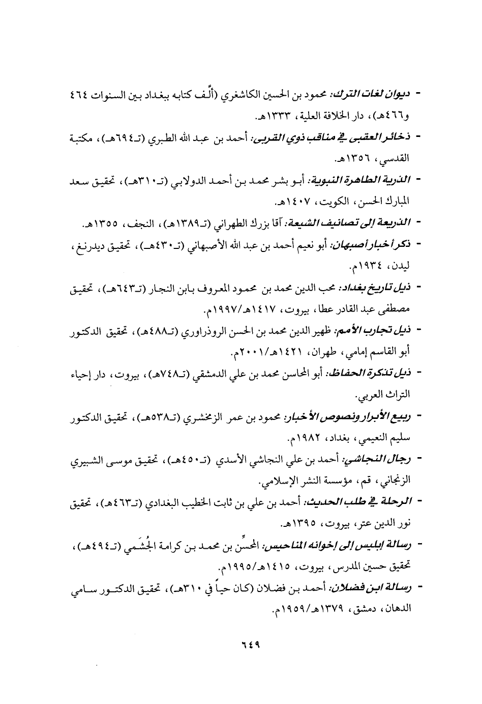 - رسالة ابن فضلان: أحمد بن فضلان (كان حيا في 310 هـ) ، تحقيق الدكتور سامي الدهان، دمشق، 1379 هـ/ 1959 م.