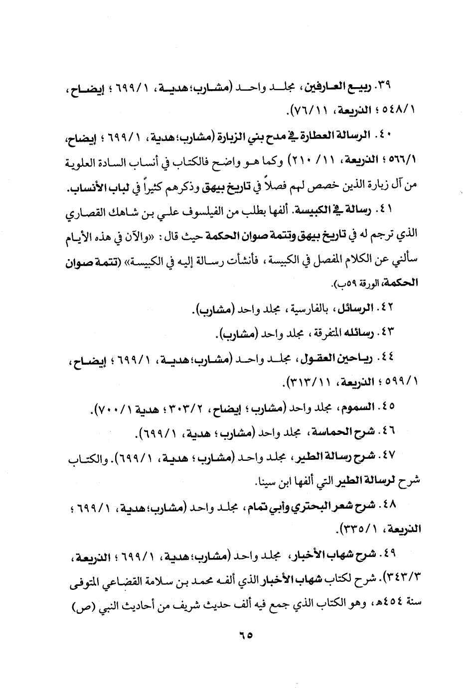 47. شرح رسالة الطير، مجلد واحد (مشارب؛ هدية، 1/699) . والكتاب شرح لرسالة الطير التي ألفها ابن سينا.