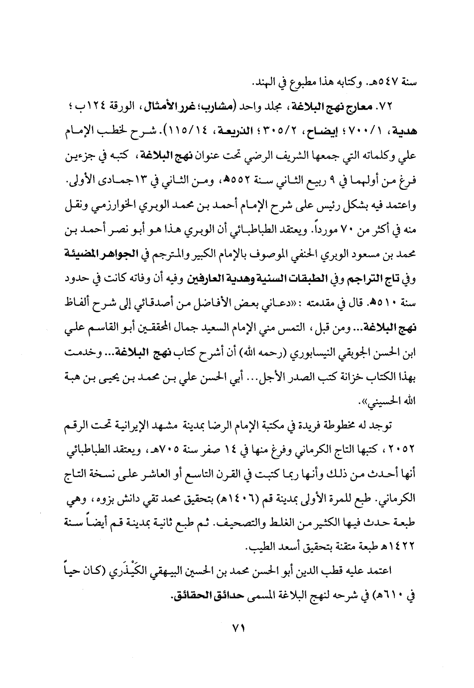 72. معارج نهج البلاغة، مجلد واحد (مشارب؛ غرر الأمثال، الورقة 124 ب؛ هدية، 1/700؛ إيضاح، 2/305؛ الذريعة، 14/115) . شرح لخطب الإمام علي وكلماته التي جمعها الشريف الرضي تحت عنوان نهج البلاغة، كتبه في جزءين فرغ من أولهما في 9 ربيع الثاني سنة 552 هـ، ومن الثاني في 13 جمادى الأولى.