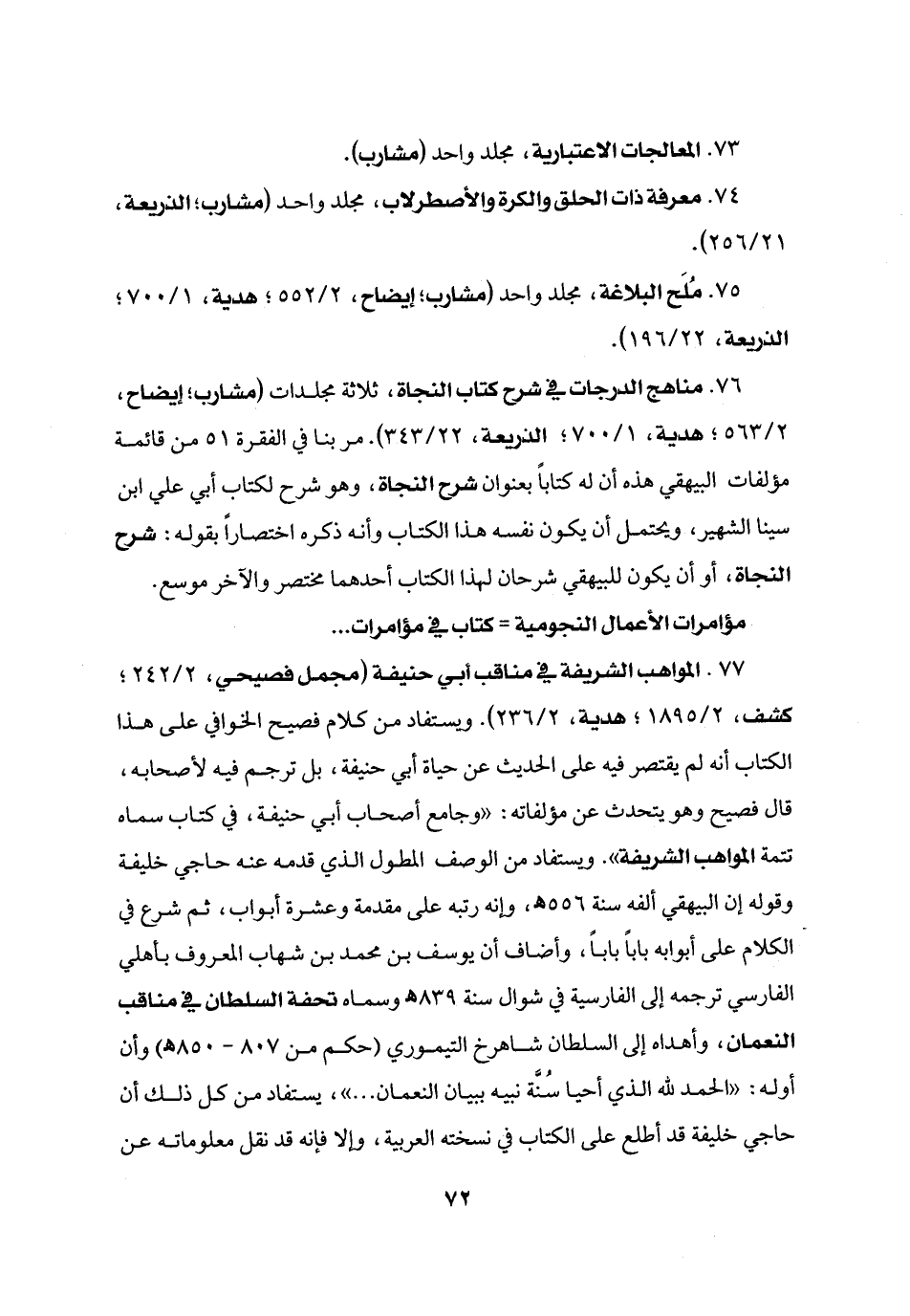 76. مناهج الدرجات في شرح كتاب النجاة، ثلاثة مجلدات (مشارب؛ إيضاح، 2/563؛ هدية، 1/700؛ الذريعة، 22/343) . مر بنا في الفقرة 51 من قائمة مؤلفات البيهقي هذه أن له كتابا بعنوان شرح النجاة، وهو شرح لكتاب أبي علي ابن سينا الشهير، ويحتمل أن يكون نفسه هذا الكتاب وأنه ذكره اختصارا بقوله: شرح النجاة، أو أن يكون للبيهقي شرحان لهذا الكتاب أحدهما مختصر والآخر موسع.
