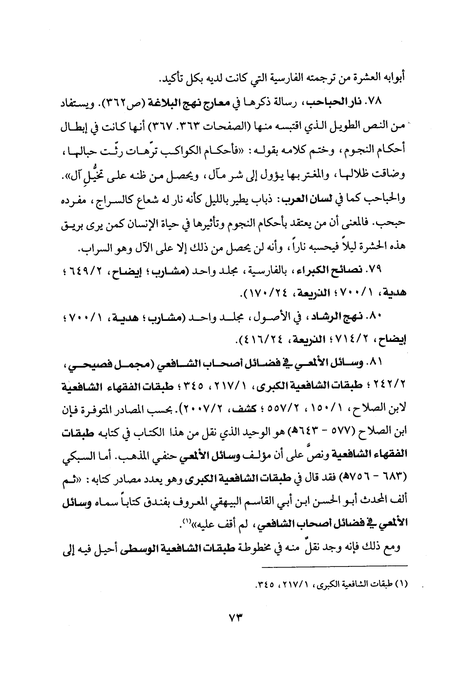 81. وسائل الألمعي في فضائل أصحاب الشافعي (مجمل فصيحي، 2/242؛ طبقات الشافعية الكبرى، 1/217، 345؛ طبقات الفقهاء الشافعية لابن الصلاح، 1/150، 2/557؛ كشف، 2/2007) . بحسب المصادر المتوفرة فإن ابن الصلاح (577- 643 هـ) هو الوحيد الذي نقل من هذا الكتاب في كتابه طبقات الفقهاء الشافعية ونصّ على أن مؤلف وسائل الألمعي حنفي المذهب. أما السبكي (683- 756 هـ) فقد قال في طبقات الشافعية الكبرى وهو يعدد مصادر كتابه: «ثم ألف المحدث أبو الحسن ابن أبي القاسم البيهقي المعروف بفندق كتابا سماه وسائل الألمعي في فضائل أصحاب الشافعي، لم أقف عليه» «1» .