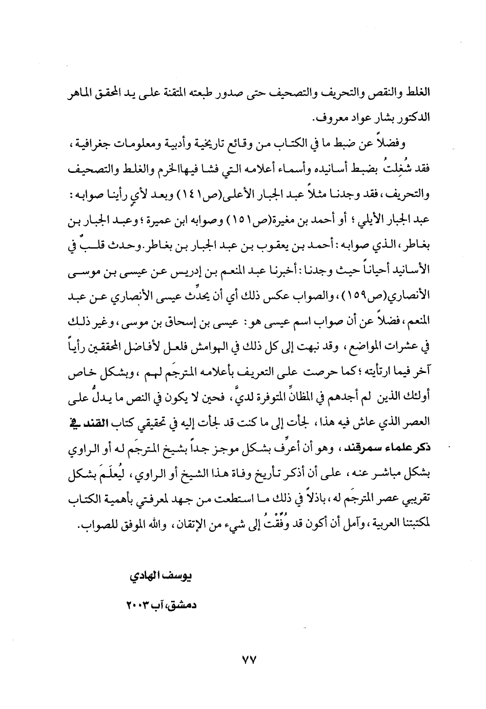 عبد الجبار الأيلي؛ أو أحمد بن مغيرة (ص 151) وصوابه ابن عميرة؛ وعبد الجبار بن بغاطر، الذي صوابه: أحمد بن يعقوب بن عبد الجبار بن بغاطر. وحدث قلب في الأسانيد أحيانا حيث وجدنا: أخبرنا عبد المنعم بن إدريس عن عيسى بن موسى الأنصاري (ص 159) ، والصواب عكس ذلك أي أن يحدّث عيسى الأنصاري عن عبد المنعم، فضلا عن أن صواب اسم عيسى هو: عيسى بن إسحاق بن موسى، وغير ذلك في عشرات المواضع، وقد نبهت إلى كل ذلك في الهوامش فلعل لأفاضل المحققين رأيا آخر فيما ارتأيته؛ كما حرصت على التعريف بأعلامه المترجم لهم، وبشكل خاص أولئك الذين لم أجدهم في المظانّ المتوفرة لديّ، فحين لا يكون في النص ما يدلّ على العصر الذي عاش فيه هذا، لجأت إلى ما كنت قد لجأت إليه في تحقيقي كتاب القند في ذكر علماء سمرقند، وهو أن أعرّف بشكل موجز جدا بشيخ المترجم له أو الراوي بشكل مباشر عنه، على أن أذكر تأريخ وفاة هذا الشيخ أو الراوي، ليعلم بشكل تقريبي عصر المترجم له، باذلا في ذلك ما استطعت من جهد لمعرفتي بأهمية الكتاب لمكتبتنا العربية، وآمل أن أكون قد وفّقت إلى شيء من الإتقان، والله الموفق للصواب.
