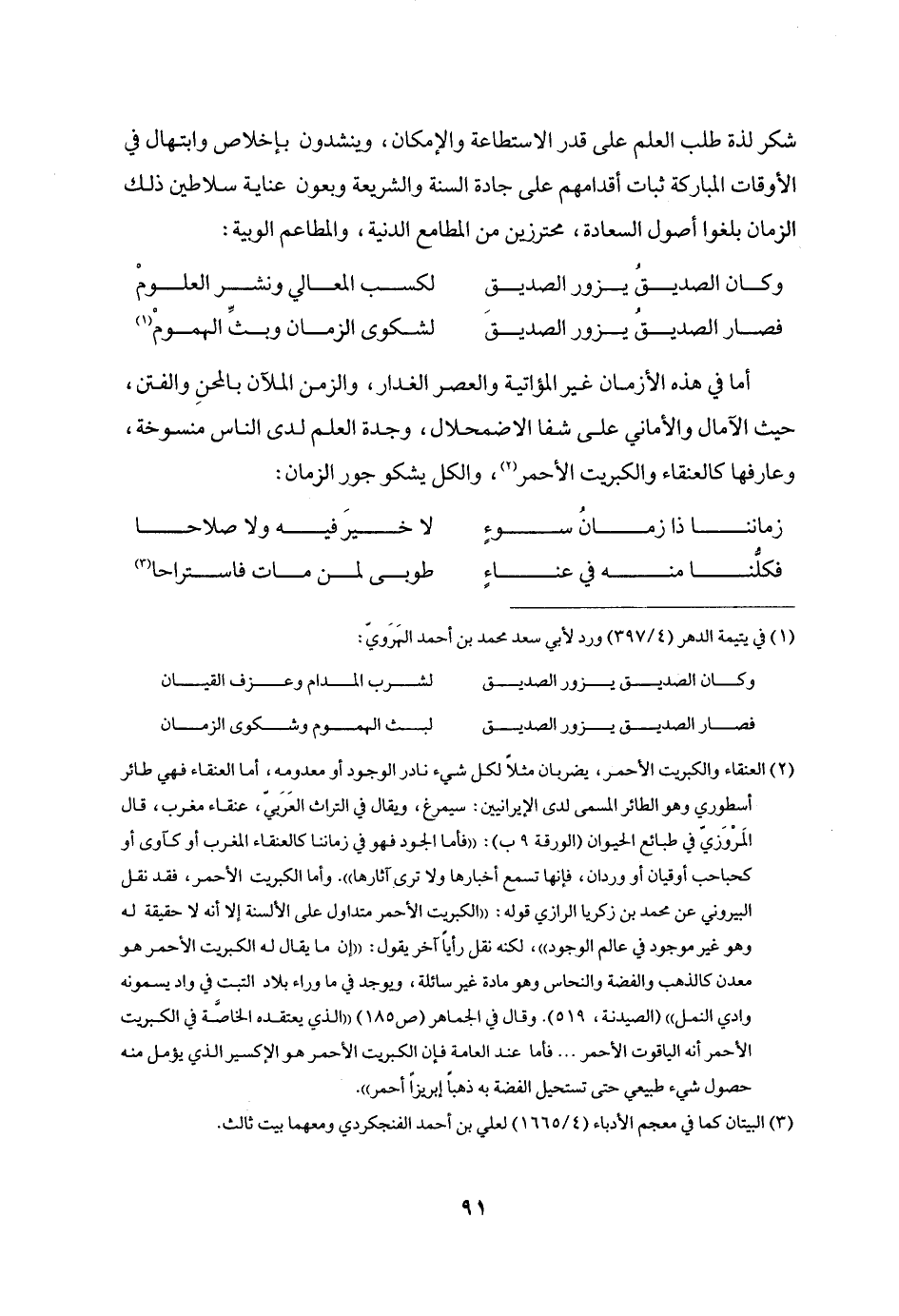 أما في هذه الأزمان غير المؤاتية والعصر الغدار، والزمن الملآن بالمحن والفتن، حيث الآمال والأماني على شفا الاضمحلال، وجدة العلم لدى الناس منسوخة، وعارفها كالعنقاء والكبريت الأحمر «2» ، والكل يشكو جور الزمان: