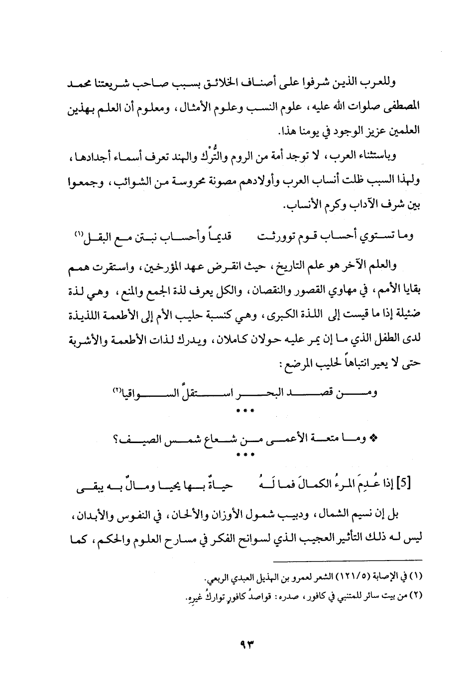 وللعرب الذين شرفوا على أصناف الخلائق بسبب صاحب شريعتنا محمد المصطفى صلوات الله عليه، علوم النسب وعلوم الأمثال، ومعلوم أن العلم بهذين العلمين عزيز الوجود في يومنا هذا.