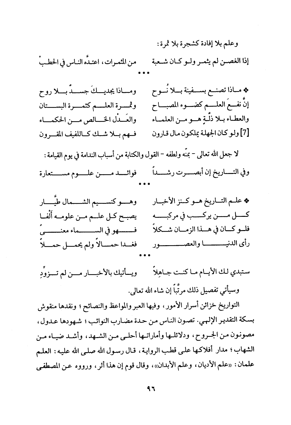 التواريخ خزائن أسرار الأمور، وفيها العبر والمواعظ والنصائح؛ ونقدها منقوش بسكة التقدير الإلهي. تصون الناس من حدة مضارب النوائب؛ شهودها عدول، مصونون من الجروح، ودلائلها وأماراتها أحلى من الشهد، وأشد ضياء من الشهاب؛ مدار أفلاكها على قطب الرواية، قال رسول الله صلى الله عليه: العلم علمان: «علم الأديان، وعلم الأبدان» ، وقال قوم إن هذا أثر، ورووه عن المصطفى