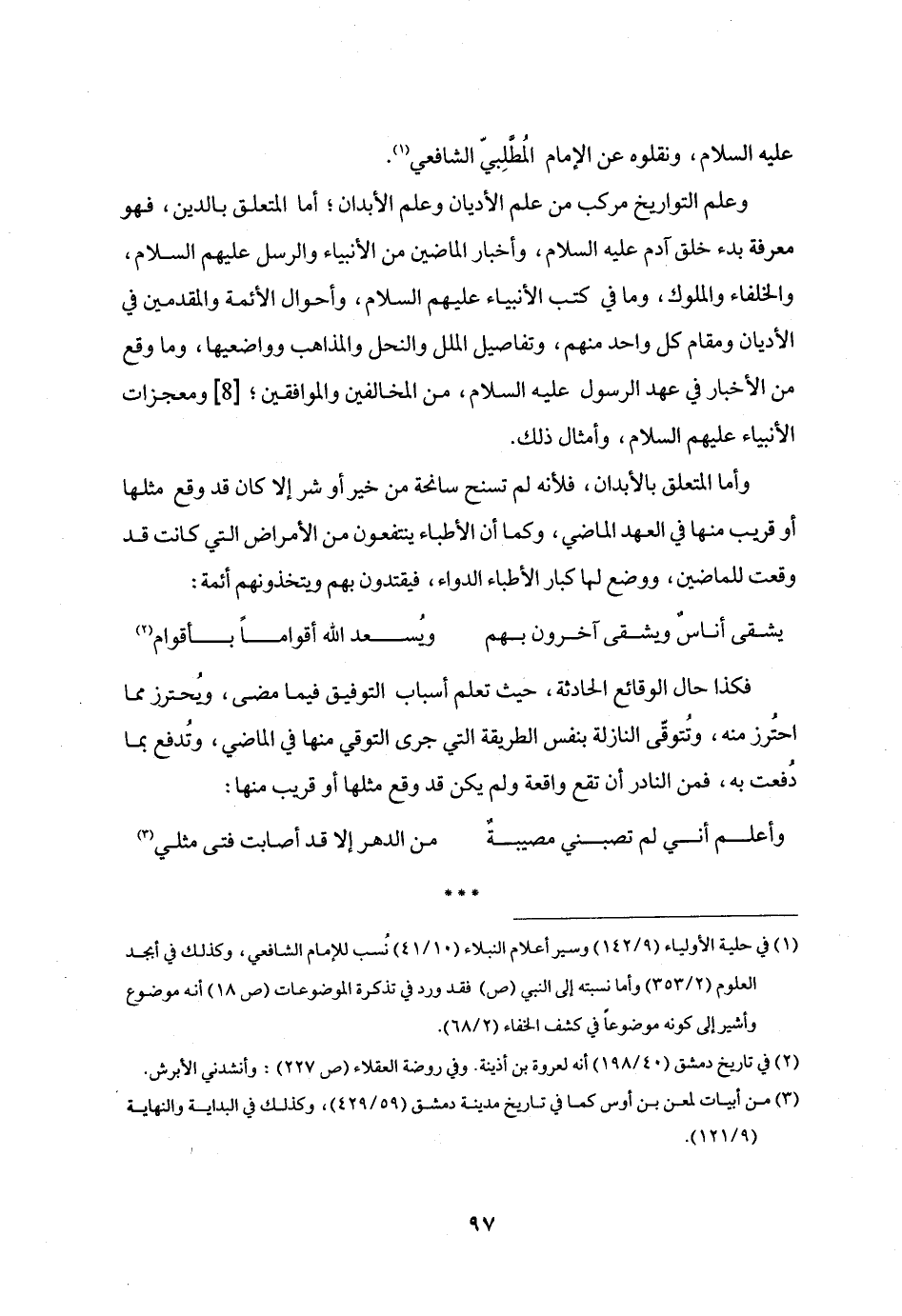 وأما المتعلق بالأبدان، فلأنه لم تسنح سانحة من خير أو شر إلا كان قد وقع مثلها أو قريب منها في العهد الماضي، وكما أن الأطباء ينتفعون من الأمراض التي كانت قد وقعت للماضين، ووضع لها كبار الأطباء الدواء، فيقتدون بهم ويتخذونهم أئمة: