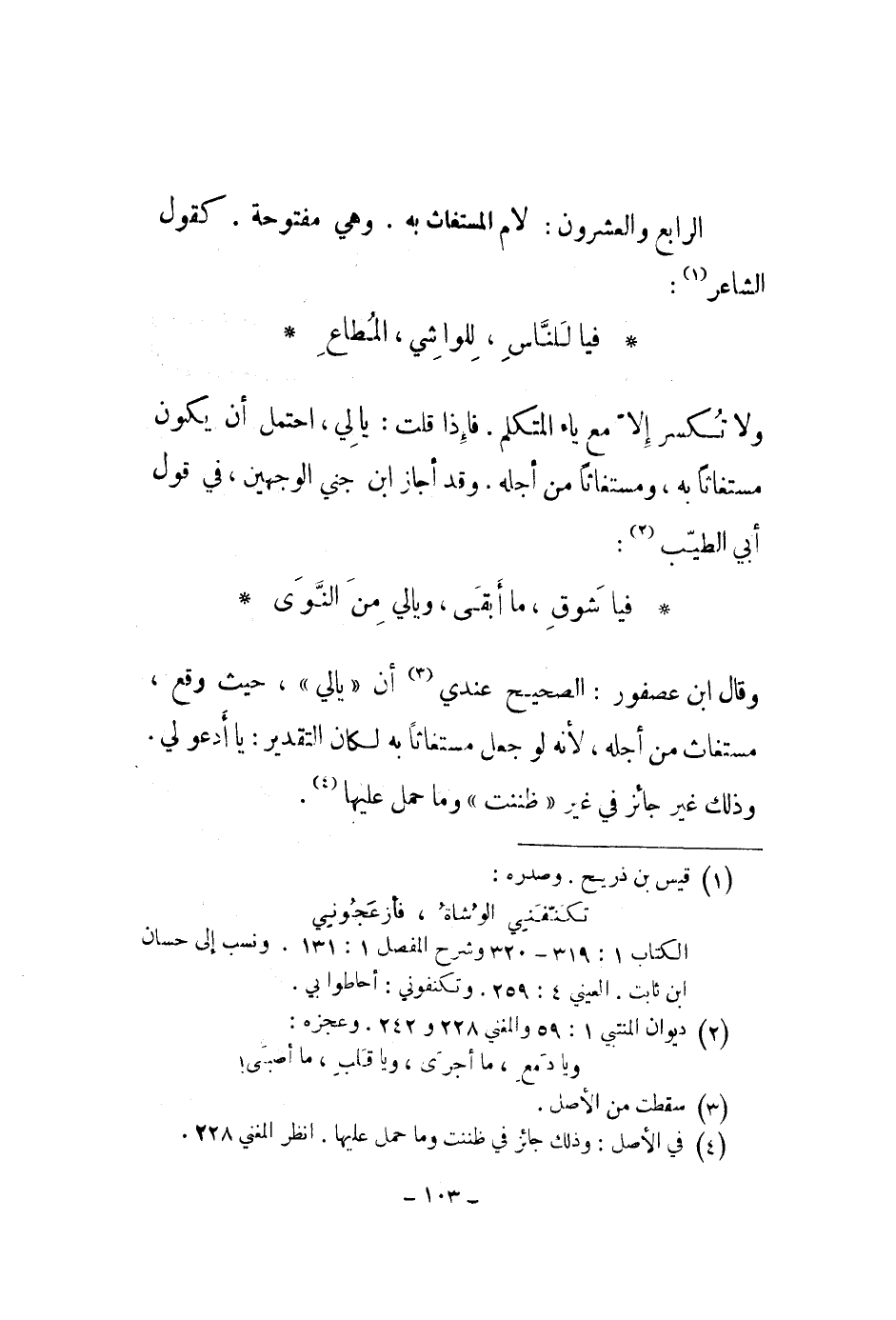 الرابع والعشرون: لام المستغاث به. وهي مفتوحة. كقول الشاعر: فيا للناس، للواشي، المطاع ولا تكسر إلا مع ياء المتكلم. فإذا قلت: يا لي، احتمل أن يكون مستغاثاً به، ومستغاثاً من أجله. وقد أجاز ابن جني الوجهين، في قول أبي الطيب: فيا شوق، ما أبقى، ويالي من النوى وقال ابن عصفور: الصحيح عندي أن يالي، حيث وقع، مستغاث من أجله، لأنه لو جعل مستغاثاً به لكان التقدير: يا أدعو لي. وذلك غير جائز في غير ظننت وما حمل عليها.