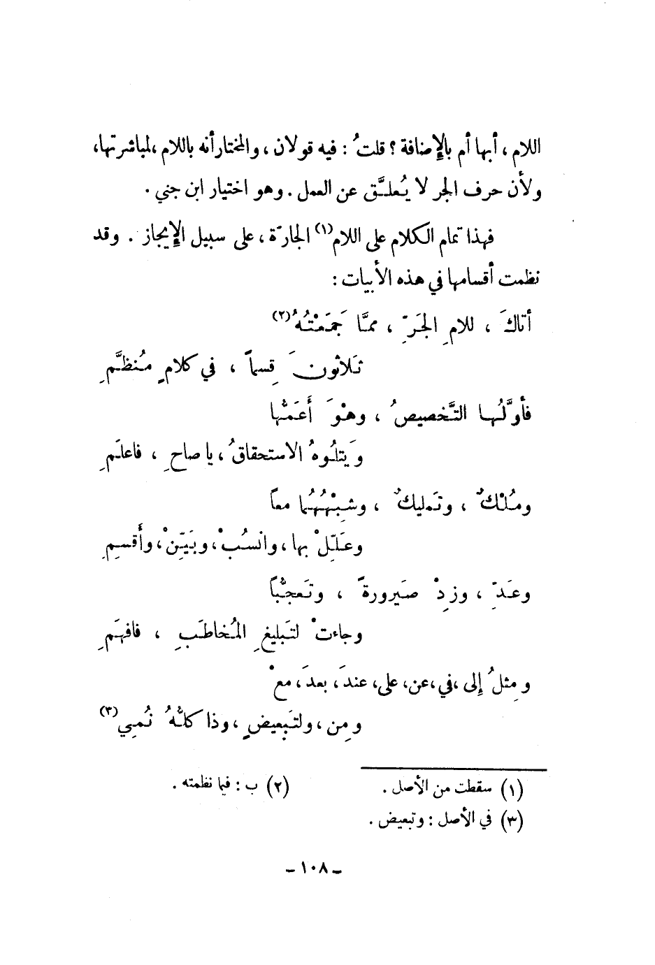 فهذا تمام الكلام على اللام الجارة، على سبيل الإيجاز. وقد نظمت أقسامها في هذه الأبيات: