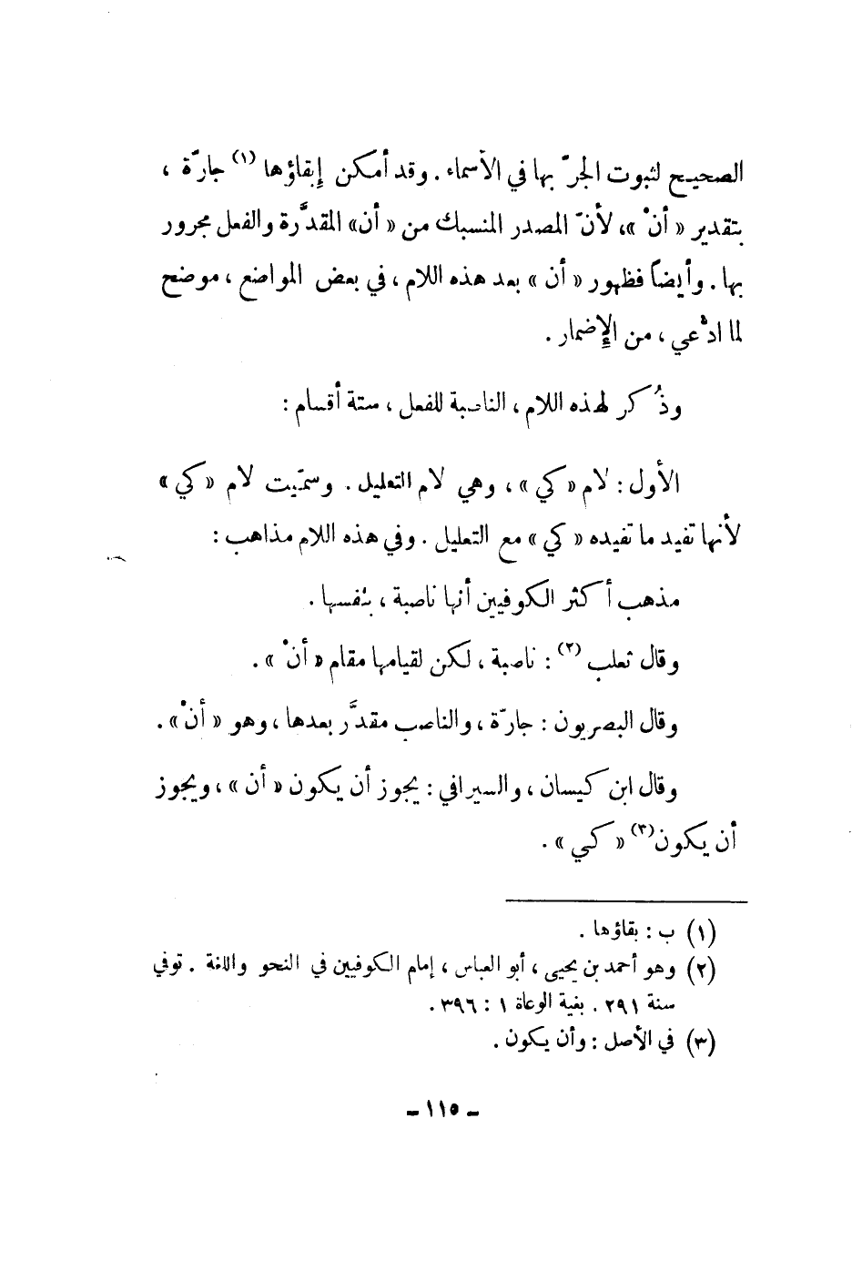 وذكر لهذه اللام، الناصبة للفعل، ستة أقسام: الأول: لام كي، وهي لام التعليل. وسميت لام كي لأنها تفيد ما تفيده كي مع التعليل. وفي هذه اللام مذاهب: مذهب أكثر الكوفيين أنها ناصبة، بنفسها.