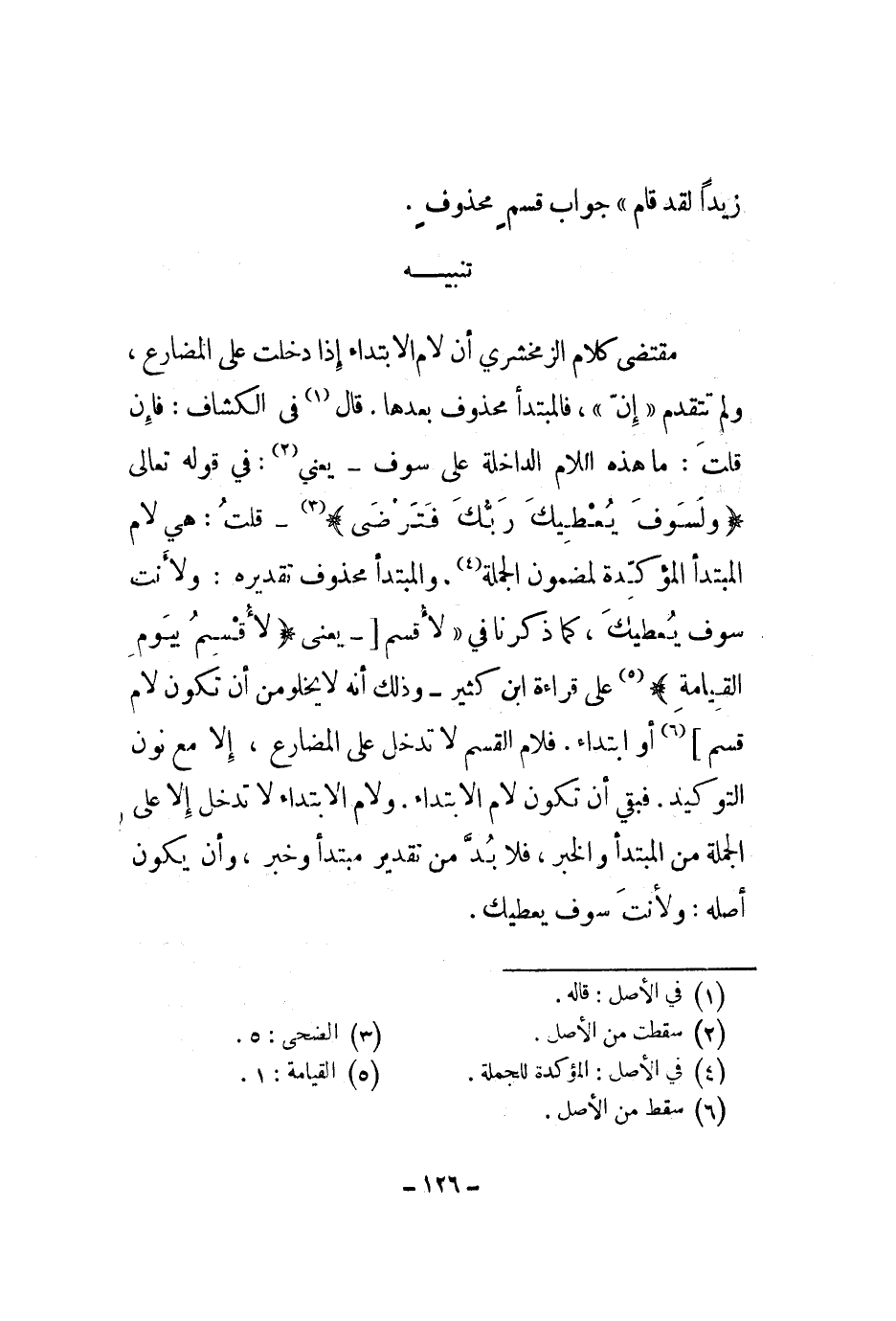 مقتضى كلام الزمخشري أن لام الابتداء إذا دخلت على المضارع، ولم تتقدم إن، فالمبتدأ محذوف بعدها. قال في الكشاف: فإن قلت: ما هذه اللام الداخلة على سوف - يعني: في قوله تعالى " ولسوف يعطيك ربك فترضى " - قلت: هي لام المبتدأ المؤكدة لمضمون الجملة. والمبتدأ محذوف تقديره: ولأنت سوف يعطيك، كما ذكرنا في لأقسم - يعنى " لأقسم بيوم القيامة " على قراءة ابن كثير - وذلك أنه لا يخلو من أن تكون لام قسم أو ابتداء. فلام القسم لا تدخل على المضارع، إلا مع نون التوكيد. فبقي أن تكون لام الابتداء. ولام الابتداء لا تدخل إلا على الجملة من المبتدأ والخبر، فلا بد من تقدير مبتدأ وخبر، وأن يكون أصله: ولأنت سوف يعطيك.