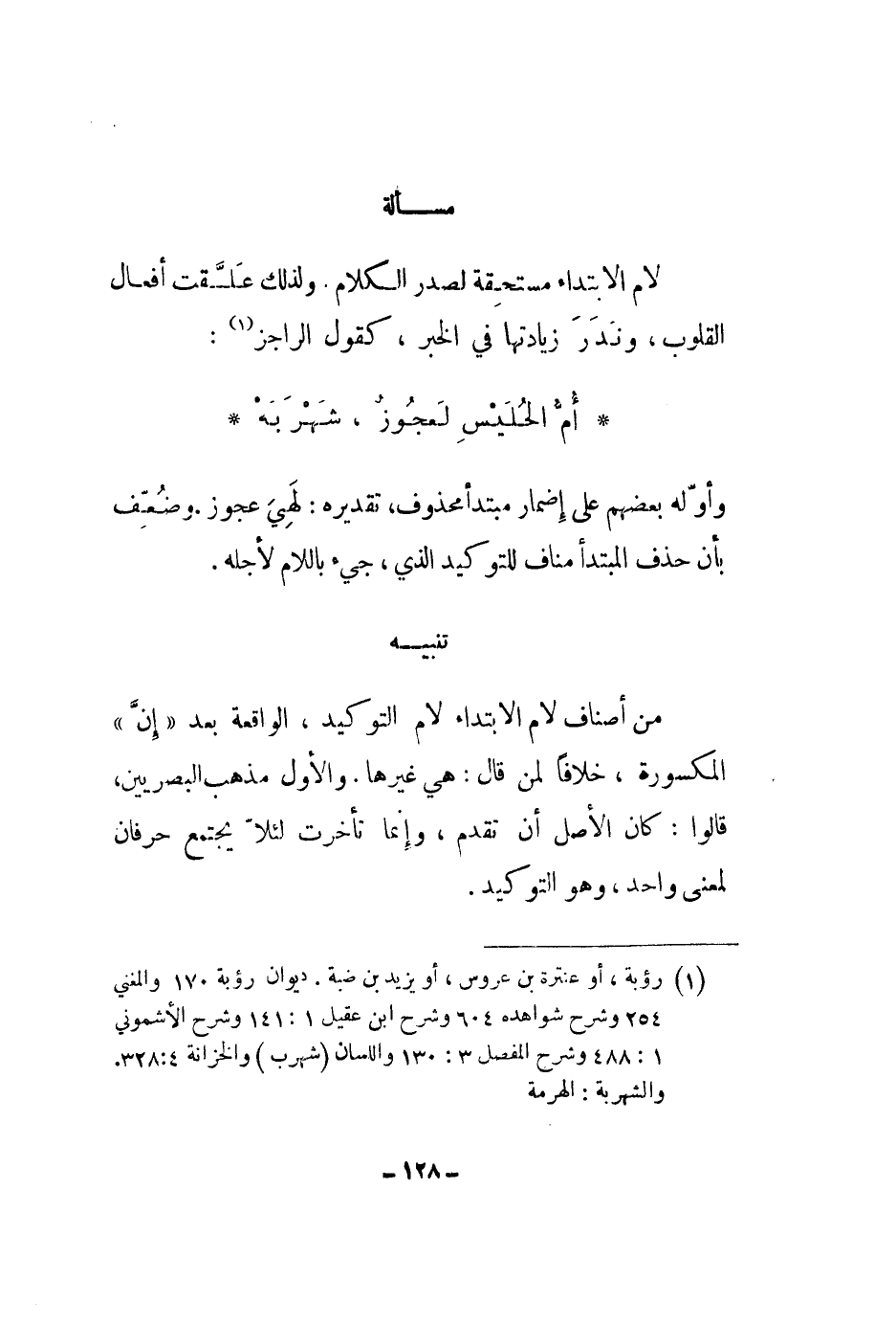 لام الابتداء مستحقة لصدر الكلام. ولذلك علقت أفعال القلوب، وندر زيادتها في الخبر، كقول الراجز: أم الحليس لعجوز، شهربه وأوله بعضهم على إضمار مبتدأ محذوف، تقديره: لهي عجوز. وضعف بأن حذف المبتدأ مناف للتوكيد الذي، جيء باللام لأجله.