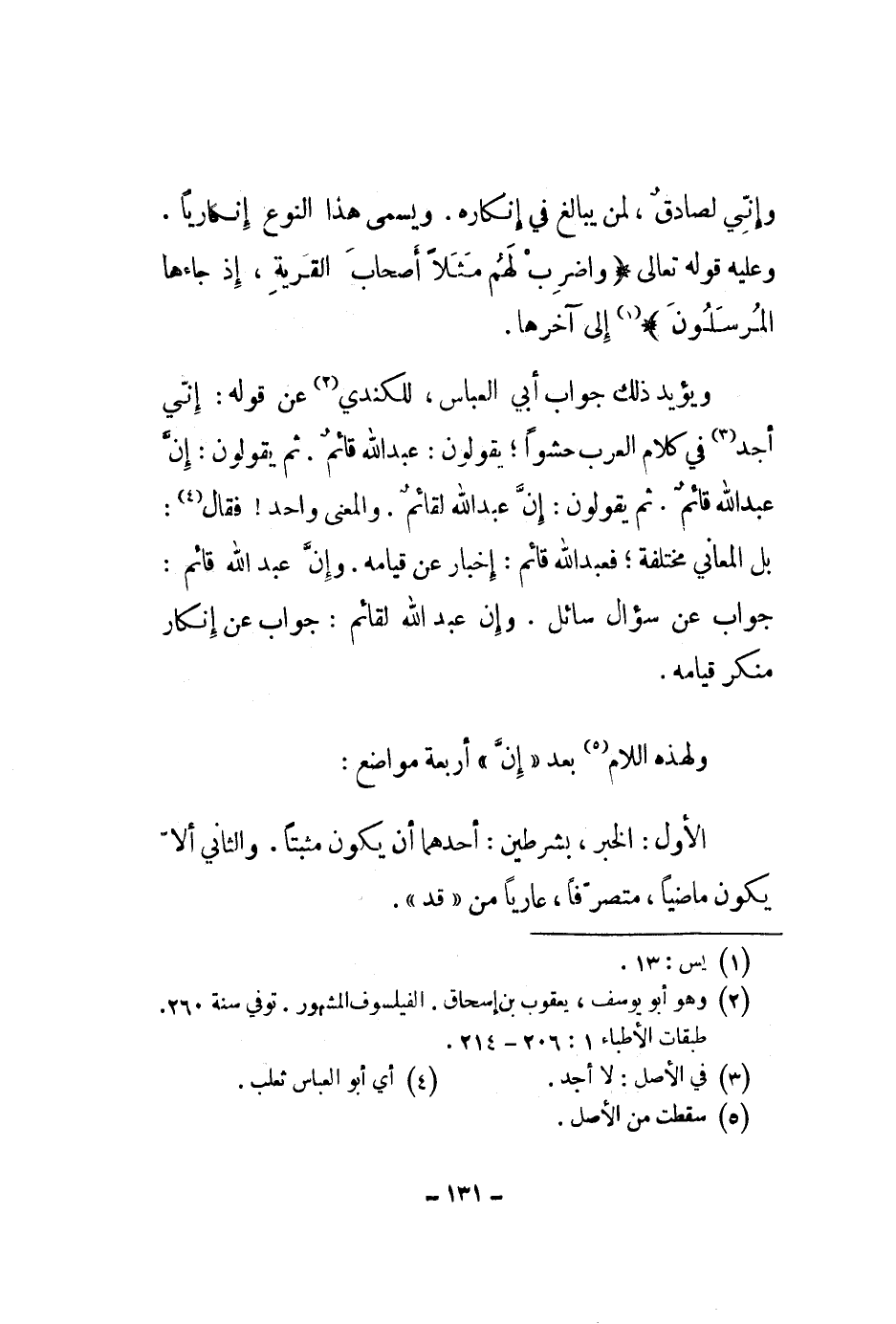 ويؤيد ذلك جواب أبي العباس، للكندي عن قوله: إني أجد في كلام العرب حشواً: يقولون: عبد الله قائم. ثم يقولون: إن عبد الله قائم. ثم يقولون: إن عبد الله لقائم. والمعنى واحد! فقال: بل المعاني مختلفة؛ فعبد الله قائم: إخبار عن قيامه. وإن عبد الله قائم: جواب عن سؤال سائل. وإن عبد الله لقائم: جواب عن إنكار منكر قيامه.