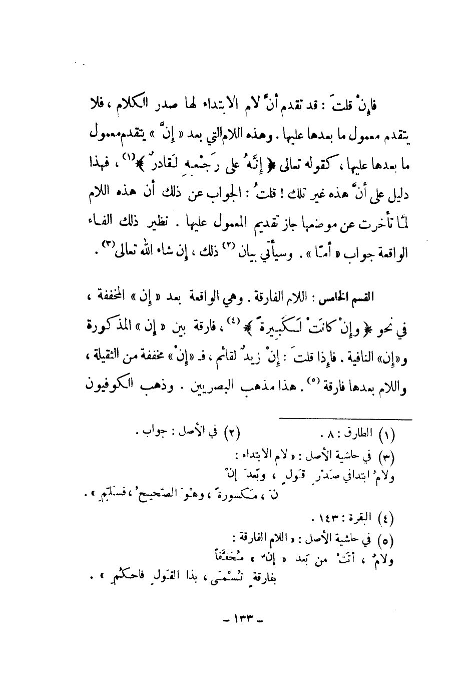 القسم الخامس: اللام الفارقة. وهي الواقعة بعد إن المخففة، في نحو " وإن كانت لكبيرة "، فارقة بين إن المذكورة وإن النافية، فإذا قلت: إن زيد لقائم، ف إن مخففة من الثقيلة، واللام بعدها فارقة. هذا مذهب البصريين. وذهب الكوفيون