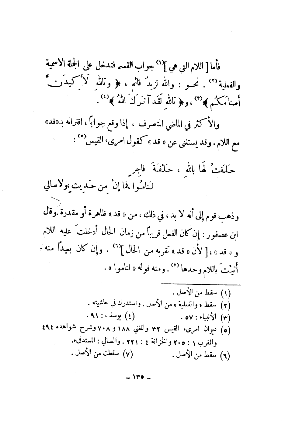 والأكثر في الماضي المتصرف، إذا وقع جواباً، اقترانه ب قد مع اللام. وقد يستغنى عن قد كقول امرىء القيس: