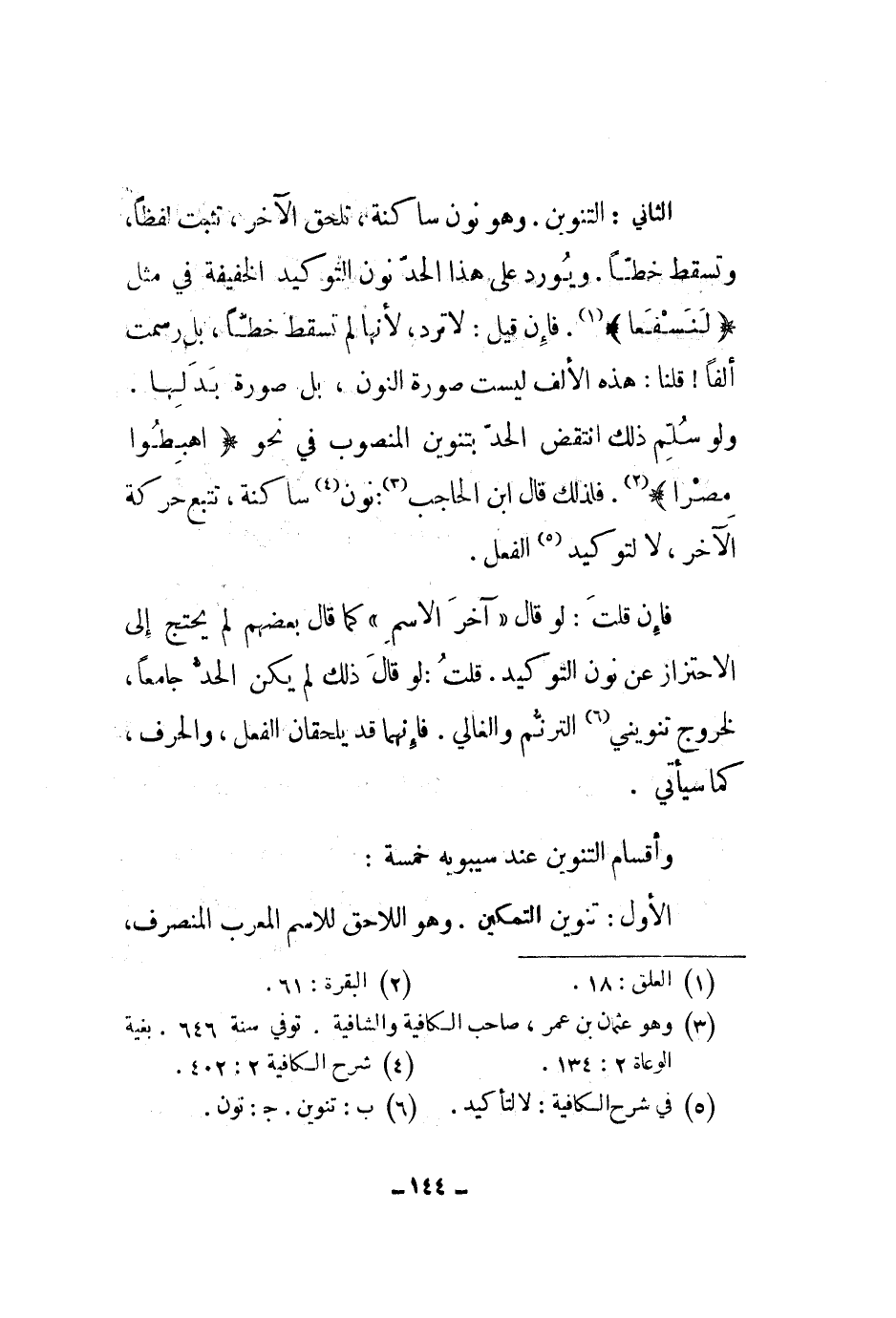 الثاني: التنوين. وهو نون ساكنة، تلحق الآخر، تثبت لفظاً، وتسقط خطاً. ويورد على هذا الحد نون التوكيد الخفيفة في مثل " لنسفعا ". فإن قيل: لا ترد، لأنها لم تسقط حطاً، بل رسمت ألفاً! قلنا: هذه الألف ليست صورة النون، بل صورة بدلها. ولو سلم ذلك انتقض الحد بتنوين المنصوب في نحو " اهبطوا مصراً ". فلذلك قال ابن الحاجب: نون ساكنة، تتبع حركة الآخر، لا لتوكيد الفعل.