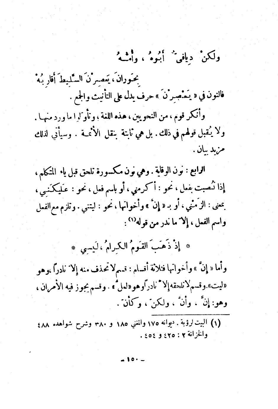الرابع: نون الوقاية. وهي نون مكسورة تلحق قبل ياء المتكلم، إذا نصبت بفعل، نحو: أكرمني، أو باسم فعل، نحو: عليكني، بمعنى: الزمني، أو ب إن وأخواتها، نحو: ليتني. وتلزم مع الفعل واسم الفعل، إلا ما ندر من قوله: إذ ذهب القوم الكرام، ليسي وأما إن وأخواتها فثلاثة أقسام: قسم لا تحذف منه إلا نادراً، وهو ليت. وقسم لا تلحقه إلا نادراً وهو لعل. وقسم يجوز فيه الأمران، وهو: إن، وأن، ولكن، وكأن.