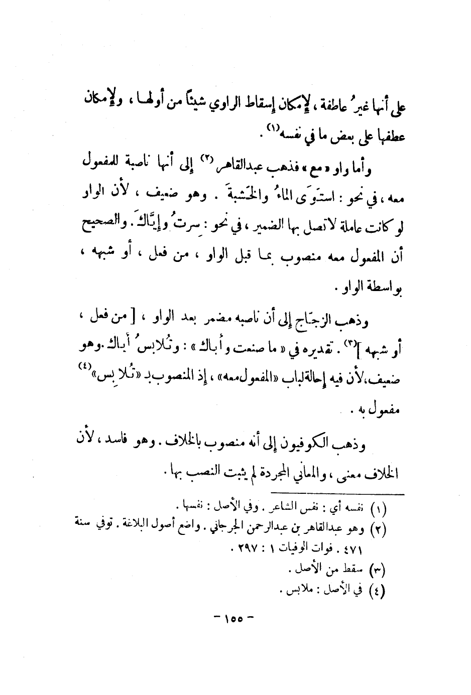 وأما واو مع فذهب عبد القاهر إلى أنها ناصبة للمفعول معه، في نحو: استوى الماء والخشبة. وهو ضعيف، لأن الواو لو كانت عاملة لا تصل بها الضمير، في نحو: سرت وإياك. والصحيح أن المفعول معه منصوب بما قبل الواو، من فعل، أو شبهه، بواسطة الواو.