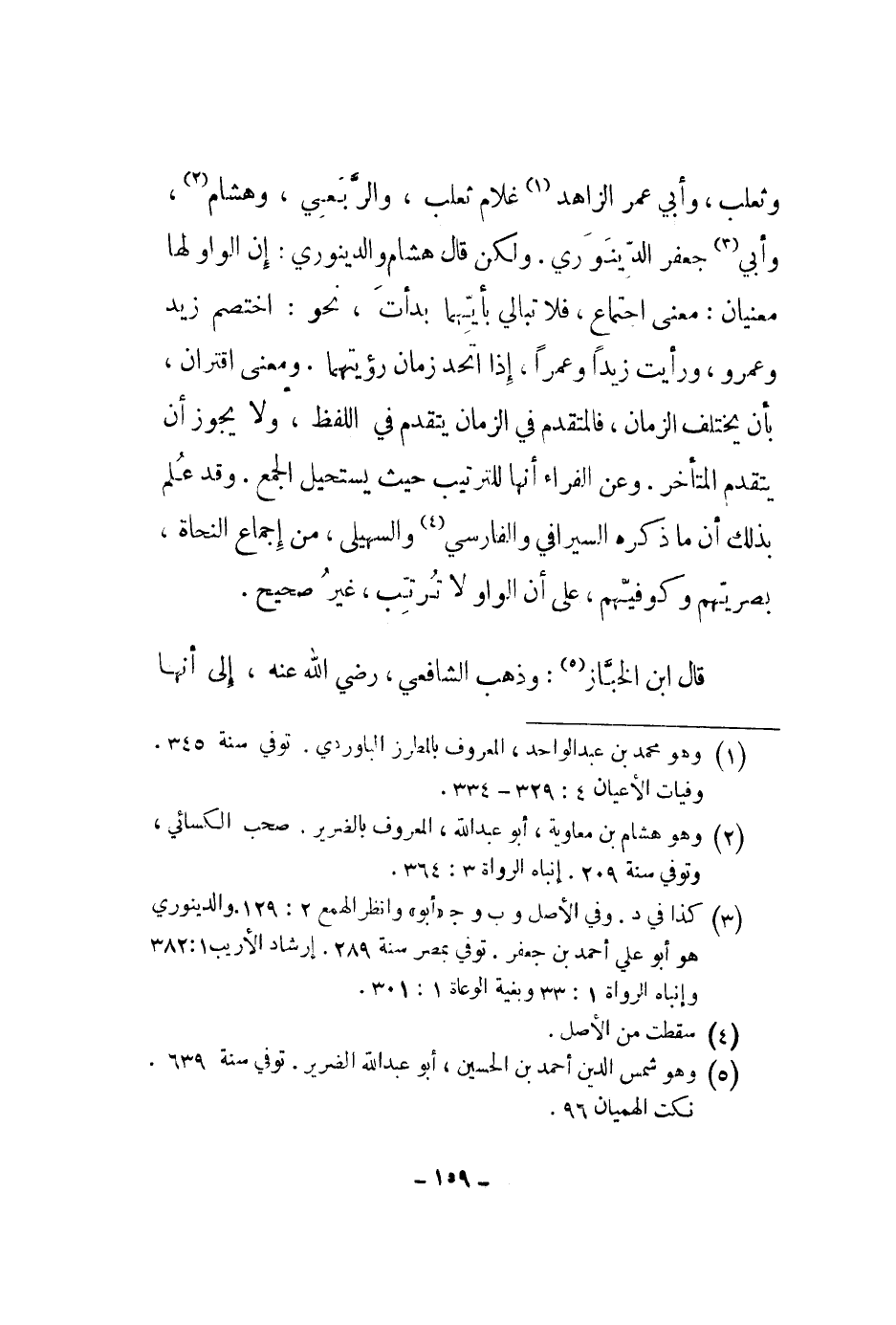 وثعلب، وأبي عمر الزاهد غلام ثعلب، والربعي، وهشام، وأبي جعفر الدينوري. ولكن قال هشام والدينوري: إن الواو لها معنيان: معنى اجتماع، فلا تبالي بأيتهما بدأت، نحو: اختصم زيد وعمرو، ورأيت زيداً وعمراً، إذا اتحد زمان رؤيتهما. ومعنى اقتران، بأن يختلف الزمان، فالمتقدم في الزمان يتقدم في اللفظ، ولا يجوز أن يتقدم المتأخر. وعن الفراء أنها للترتيب حيث يستحيل الجمع. وقد علم بذلك أن ما ذكره السيرافي والفارسي والسهيلي، من إجماع النحاة، بصريتهم وكوفيهم، على أن الواو لا ترتب، غير صحيح.