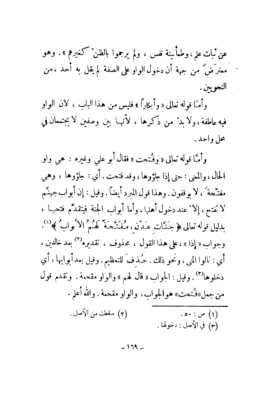 وأما قوله تعالى وفتحت فقال أبو علي وغيره: هي واو الحال، والمعنى: حتى إذا جاؤوها، وقد فتحت. أي: جاؤوها، وهي مفتحة، لا يوقفون. وهذا قول المبرد أيضاً. وقيل: إن أبواب جهنم لا تفتح، إلا عند دخول أهلها، وأما أبواب الجنة فيتقدم فتحها، بدليل قوله تعالى " جنات عدن، مفتحة لهم الأبواب ". وجواب إذا، على هذا القول، محذوف، تقديره بعد خالدين، أي: نالوا المنى، ونحو ذلك. حذف للتعظيم. وقيل بعد أبوابها، أي دخلوها. وقيل: الجواب قال لهم والواو مقحمة. وتقدم قول من جعل فتحت هو الجواب، والواو مقحمة. والله أعلم.